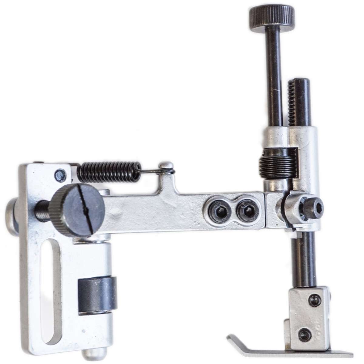 The Flip Down Roller Edge Guide makes simple work of stitching borders and edges! Can be easily mounted and adjusted to fit a wide range of widths and sizes of leather. Comes with two replaceable attachments: One straight edge guide and one roller guide. Fits Cobra Class 3,4 and King Cobra machines.