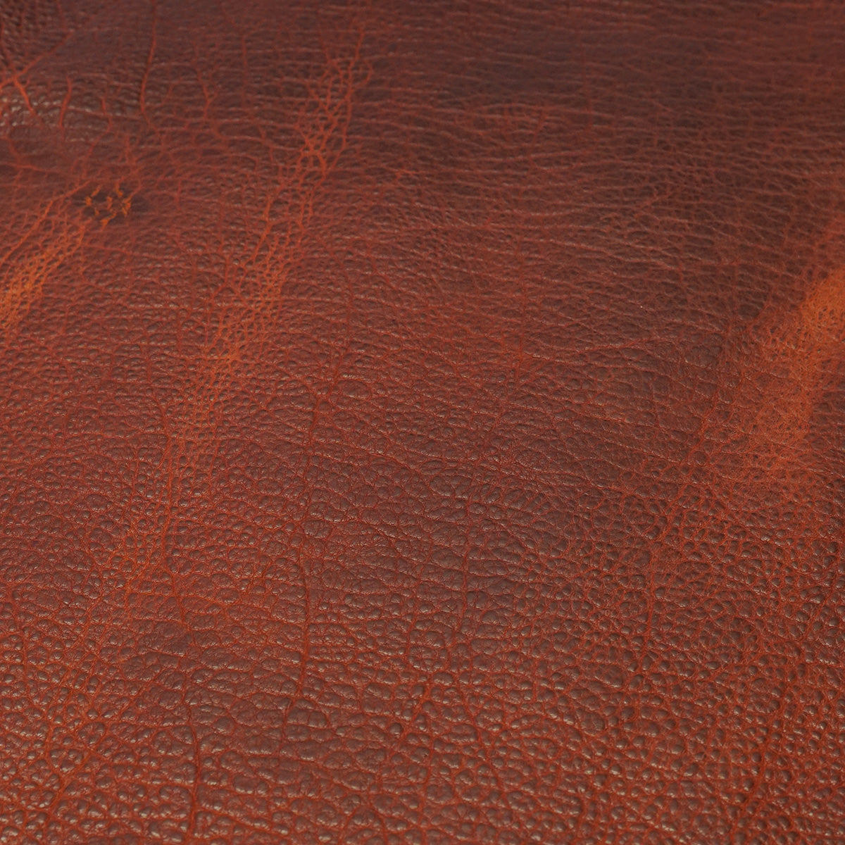 This glorious leather has a slightly glazed finish that handsomely overlays the two-tone colors of a darker, reddish brown rubbed over a deep tan base. The pull-up is just amazing, and so is the heavy bison grain which changes throughout the side.