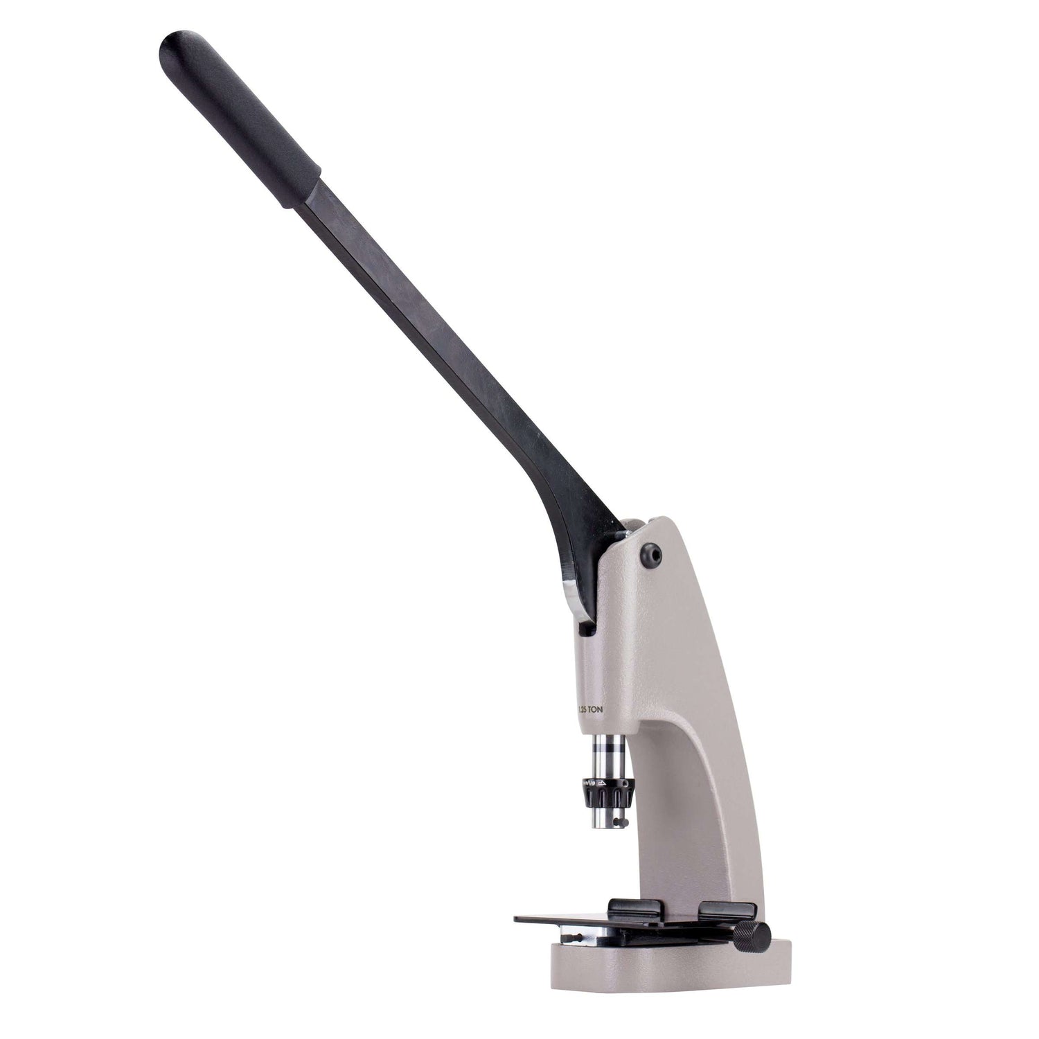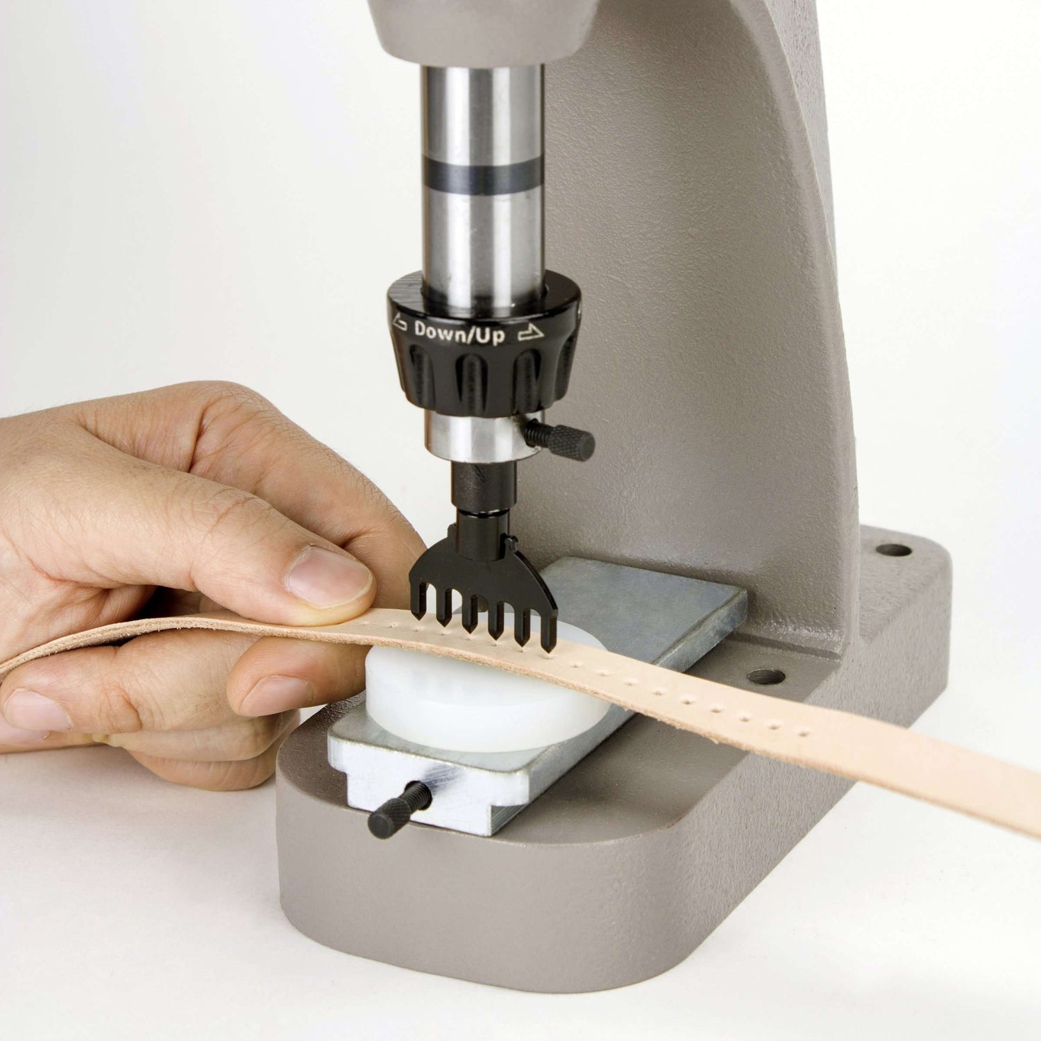 This is a complete, patented hand press system designed to work with over 20 custom setting dies (sold separately) to set grommets, eyelets, rivets (including tubular rivets and rivets and burrs), snaps, and spots! Will also punch hardware and stitching holes! This multi-purpose press could also be used as a dedicated machine for imprinting and embossing vegetable tanned leather.