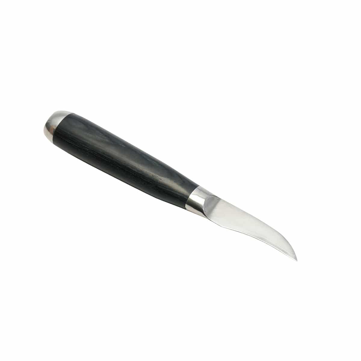 Both Damascus Trim Knives feature a Pakka-Wood handle. The grain is clearly visible on the handle of the curved blade, but the handle on the straight blade has a slightly darker color, which makes the grain a little less visible. DTK