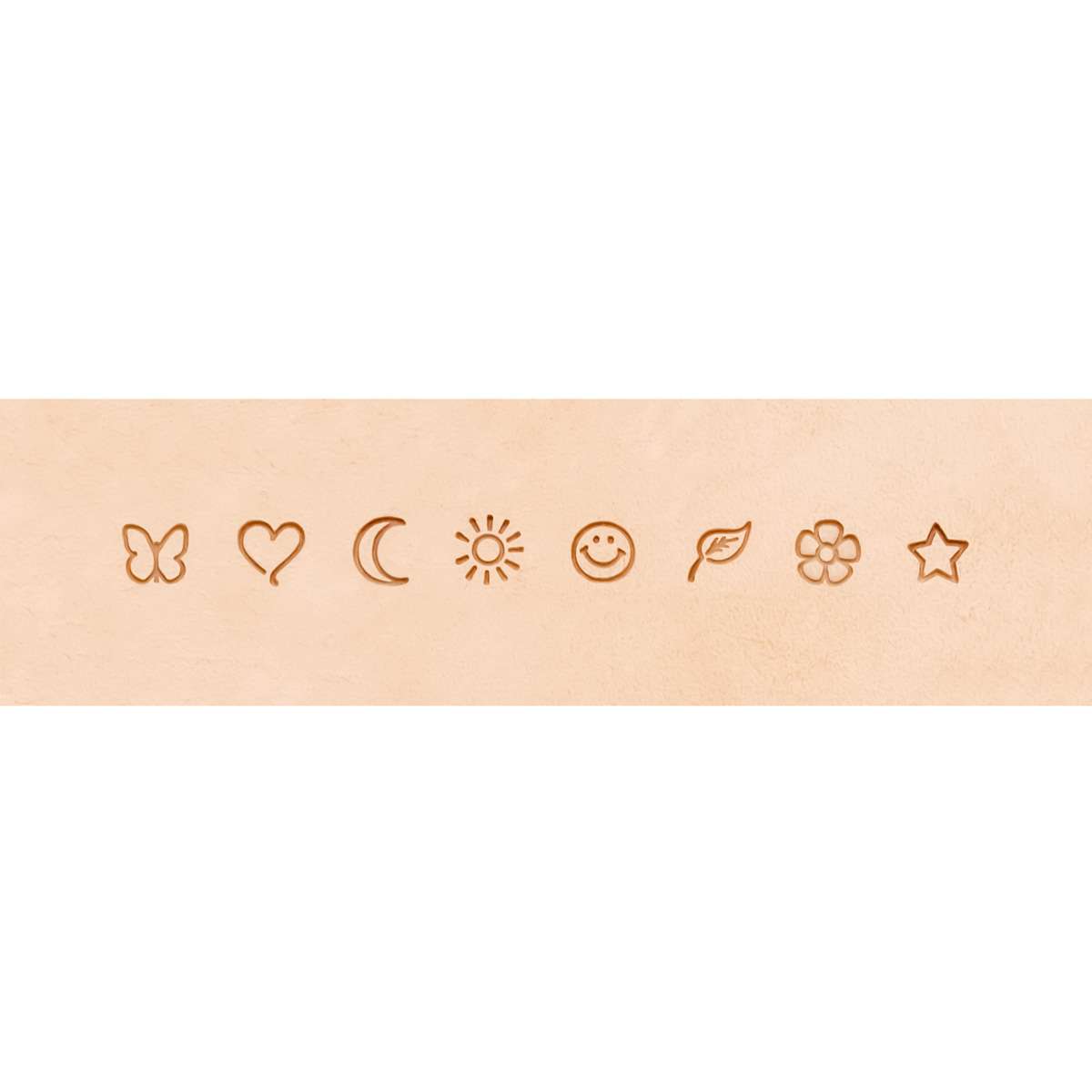 8 piece assorted 3/8" stamps. Includes 3-5/8" stamp handle.
