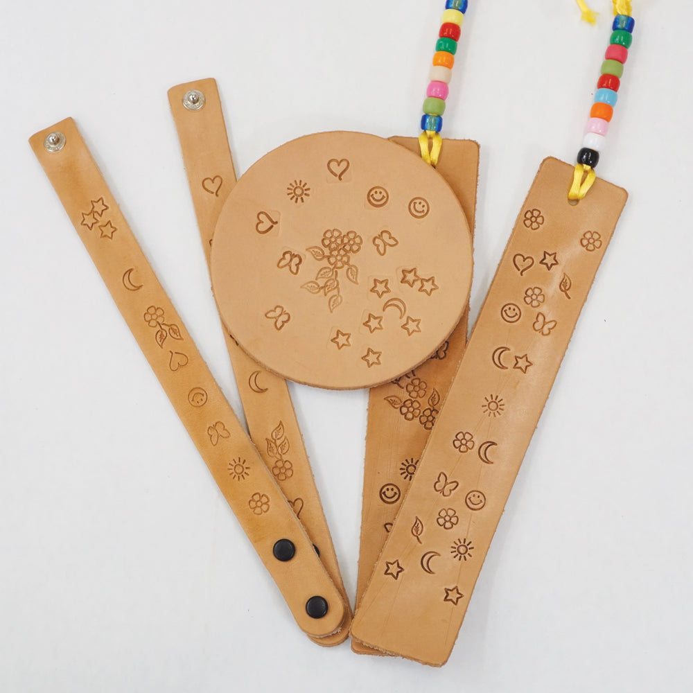 Get your youngster excited about something besides video games! Give the gift of leathercraft. This kit introduces basic skills through hands-on projects that will get your young one involved in a hobby that could last a lifetime! Kit includes: (1) Fun Time stamp set, (1) 4 oz. Bottle of Goof Proof, (1) Sponge, (1) Poly mallet, (8) Wristbands with snaps, (4) 3-3/4" Rounders, (3) Bookmarks, (1) Practice piece, and (1) Pack of miscellaneous beads and string.