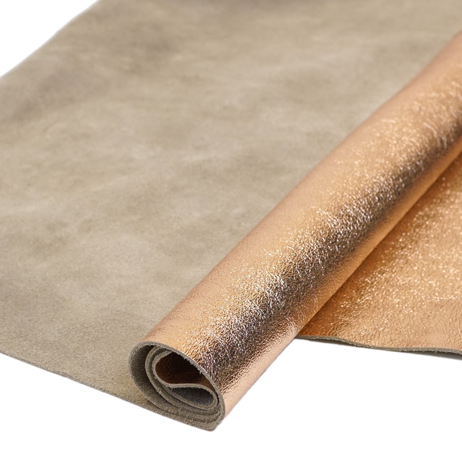 Rose Gold Milled Metallic Side. 2 - 3 oz. Sides average 22 - 28 sq ft. Sold by the sq ft. We WILL cut.