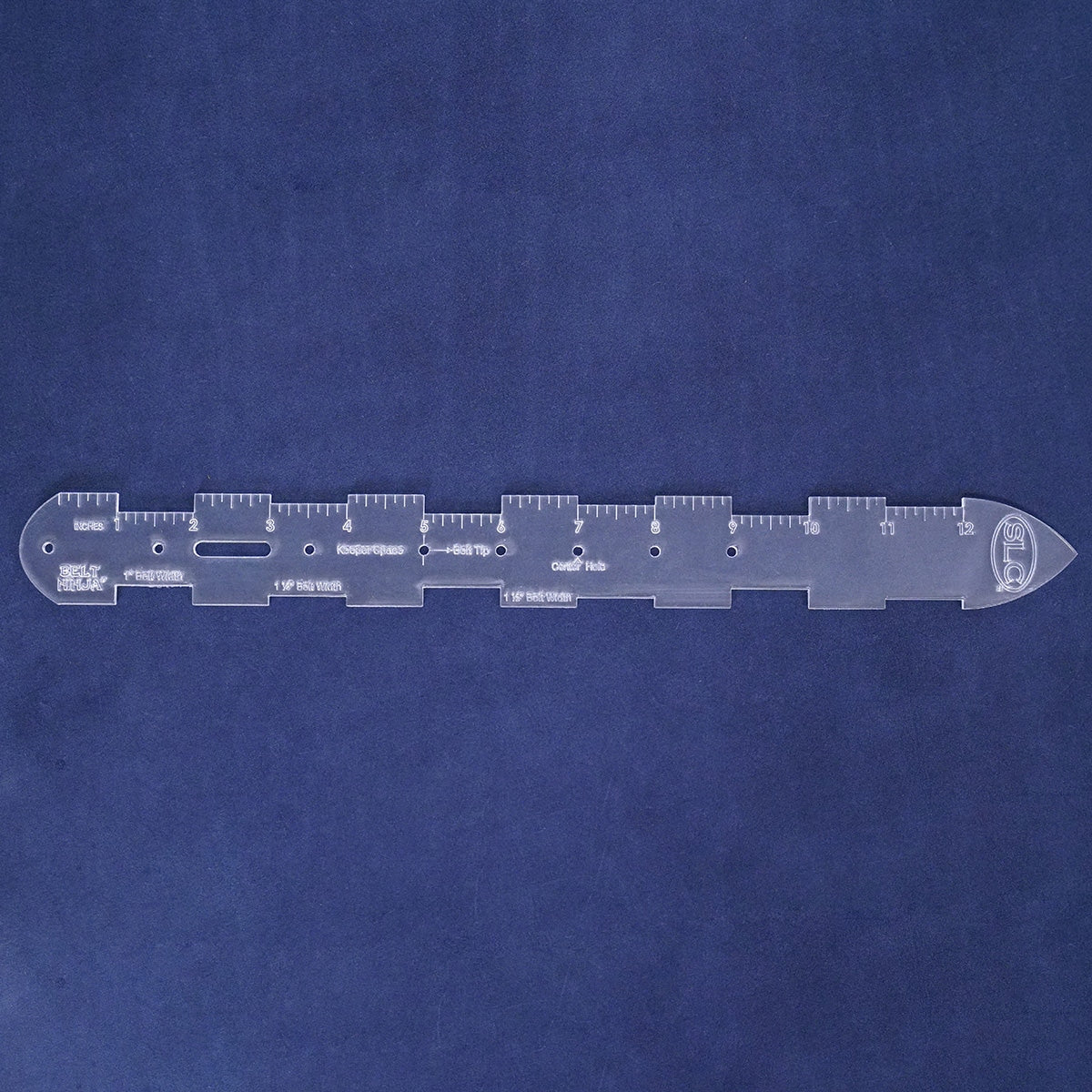 Belt makers rejoice! This multi-functional belt marking template is designed to make measuring and marking turn-backs and belt sizing holes a cinch... (pun intended)! Quickly center and mark turn-backs and sizing holes precisely, without having to do any tedious measuring! Simply place the Belt Ninja on top of your 1”, 1-1/4”, or 1-1/2” belt strip and align the width of the strip flush with the clearly marked, corresponding sized notches and there you have it! This strong, acrylic template features a 12” measuring rule, 4 holes and 1 slot for the turn-back, 5 holes for sizing; including the center hole, graduated notches for 3 strip widths, and a strap end. Available in two strap end styles: English (pointed) Tip and Round Tip. BLTN