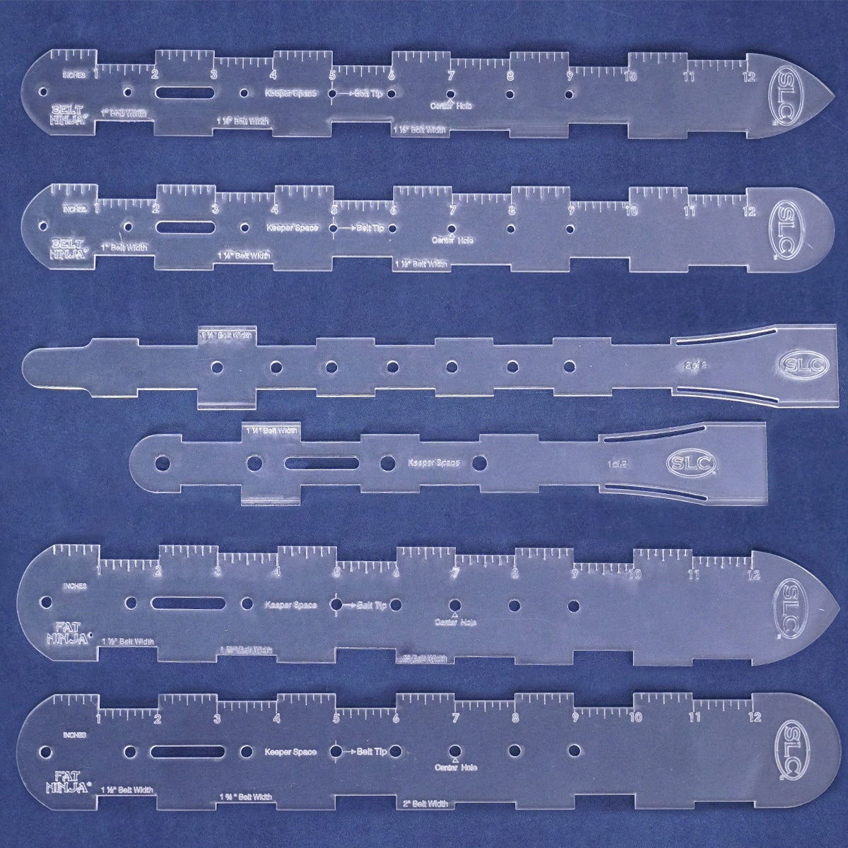 Belt makers rejoice! This multi-functional belt marking template is designed to make measuring and marking turn-backs and belt sizing holes a cinch... (pun intended)! Quickly center and mark turn-backs and sizing holes precisely, without having to do any tedious measuring! Simply place the Belt Ninja on top of your 1”, 1-1/4”, or 1-1/2” belt strip and align the width of the strip flush with the clearly marked, corresponding sized notches and there you have it! This strong, acrylic template features a 12” measuring rule, 4 holes and 1 slot for the turn-back, 5 holes for sizing; including the center hole, graduated notches for 3 strip widths, and a strap end. Available in two strap end styles: English (pointed) Tip and Round Tip. BLTN