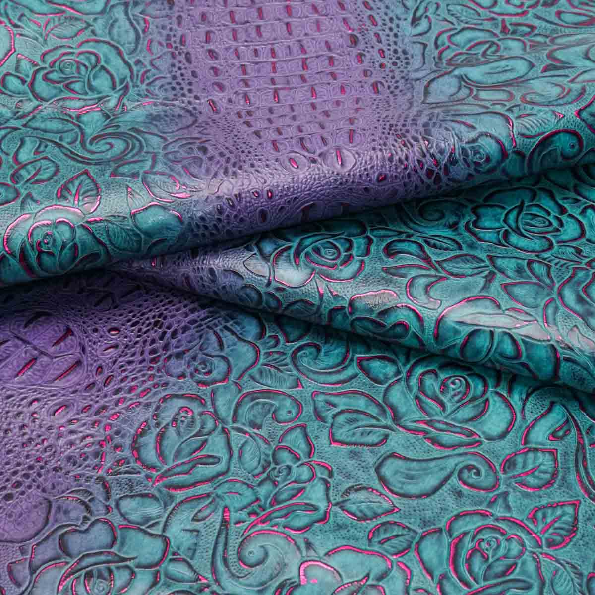 Get the best of both worlds with our Floral Croc Embossed Cow! Featuring the prized Hornback design, bordered by a large, bold floral print, in a repeating pattern (print runs length of side NOT width, neck to butt). Done in two-tone colors, with a magnificent tipping process that highlights every detail and illustrates depth. This fun and unique design is perfect for clutches and bags of all sorts, totes, belts, and other personal leather goods, as well as upholstery applications like seat and ottoman covers, and cabinet and table inlays.