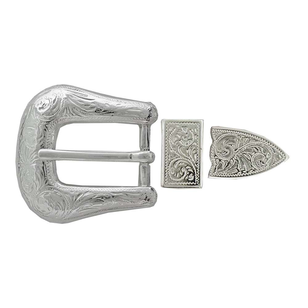 Floral engraved. Available in shiny silver or gold plate. Fits 3/4" belts.