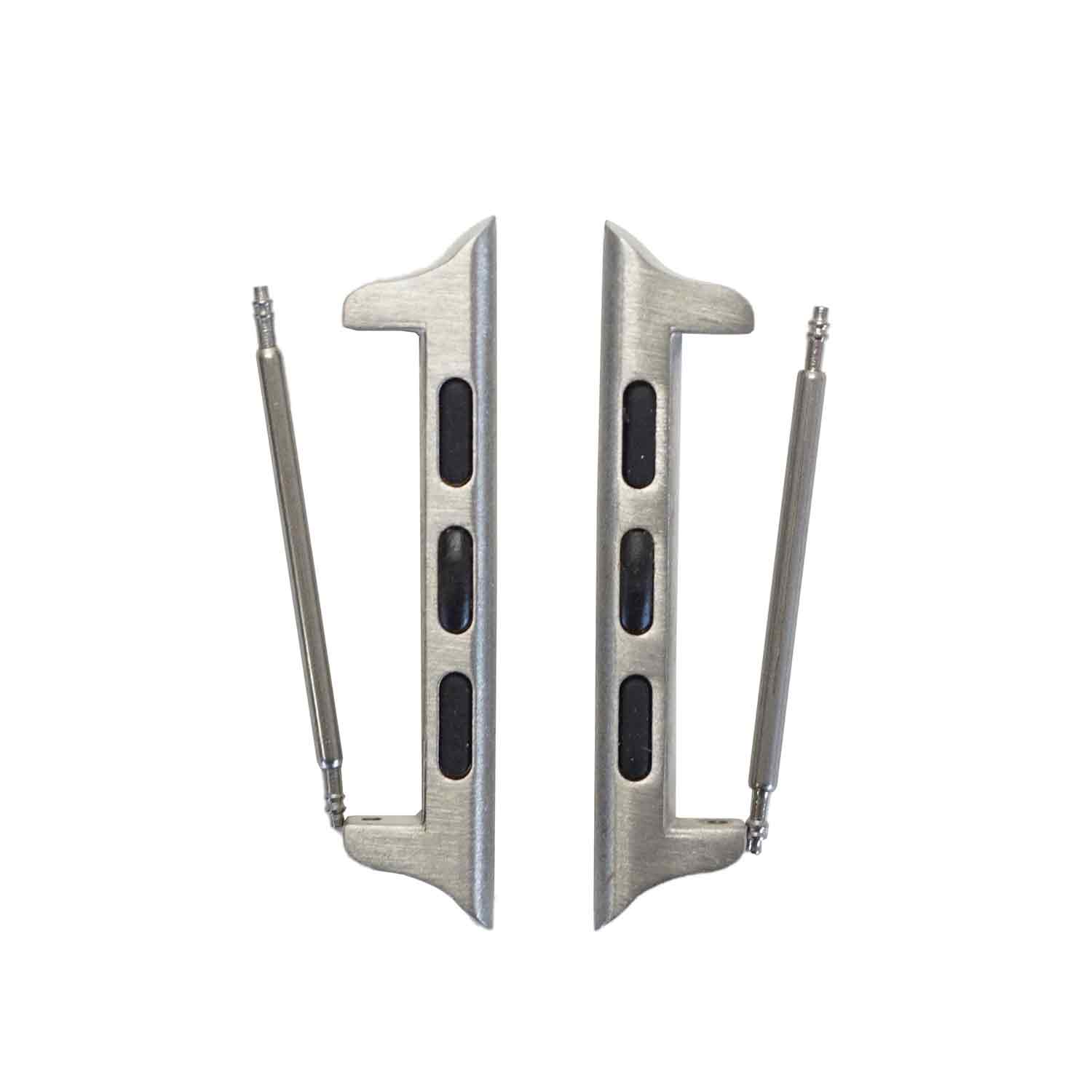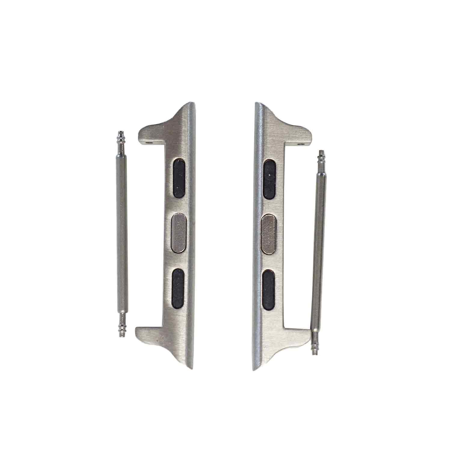 Smart Watch Strap Connector - Silver. Available in 42 mm. and 38 mm. The 42 mm. connector is 1-3/8" and will fit a 15/16" band and the 38 mm. is 1-1/4" and will fit a 7/8" band. 2 Piece set with spring bars. Will accommodate watch straps with thicknesses up to 3.5 mm. (approximately 8 - 9 oz.). The 42 and 38 mm. indicate what size watch face they will fit.