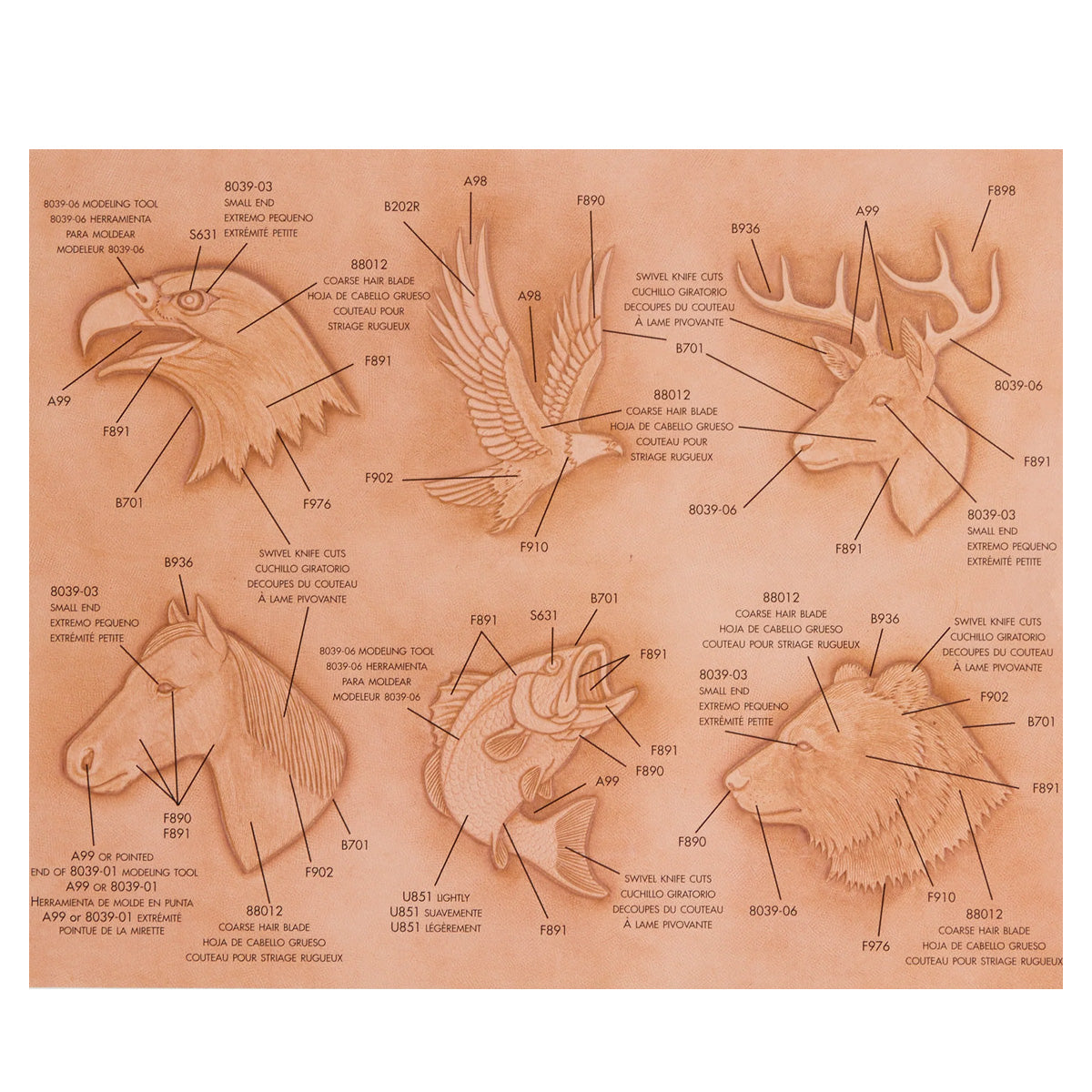 Craftaid reusable templates are the easiest way to transfer tooling patterns to leather projects. The raised design imprints the pattern into damp leather. Included is a photo carve diagram showing the tools and techniques used for best results.