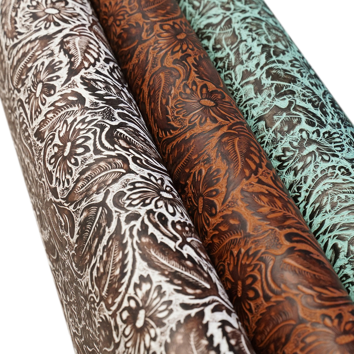 These floral embossed cow sides have been hand tipped for a striking two-tone finish! Available in four gorgeous colors, all tipped with a rich medium brown, and in such a way that gives the leather that highly desirable, worn, rustic look that never seems to go out of style! Great for high-end bags, clutches, and wallets, as well as laminated belts, upholstery, and home décor applications!
