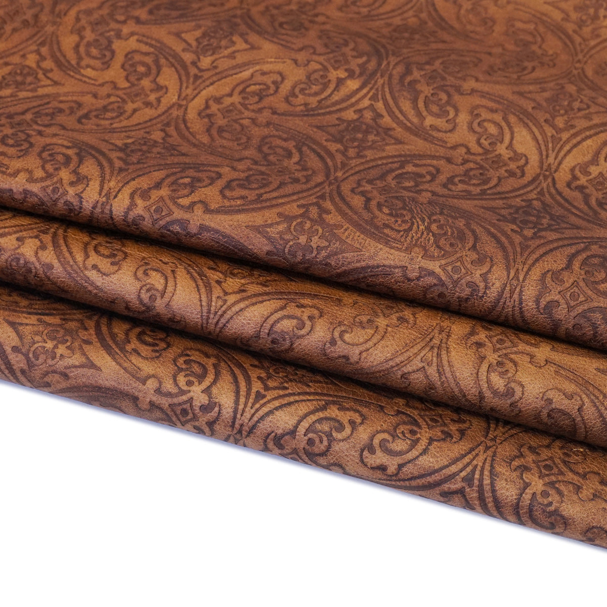 Note: Order what you want. We’ll cut it for you.Very ornate with fancy details, this leather is reminiscent of the dramatic architectural structures of post-renaissance Europe. The bold, heraldic styling lends itself to this captivating design’s gothic appeal. Great for Bags, totes, and clutches, as well as upholstery applications such as seat and ottoman covers, and table, cabinet, and desk inlays. FCH
