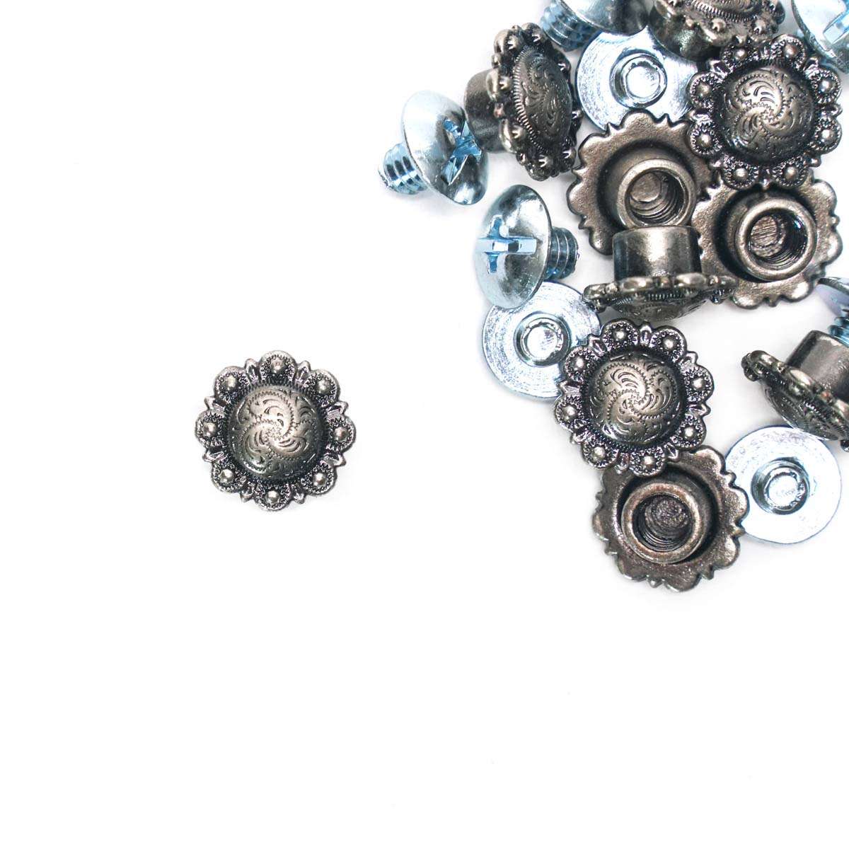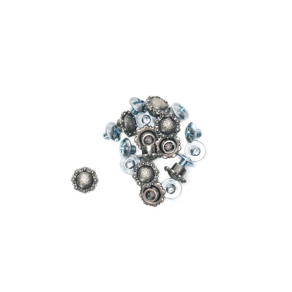 Decorative Screw Post/Concho. Spiral Berry or Floral Rope Edge are available in 3 finish options. Both measure 7/16" across and have a 3/16" screwback. Sold in 10pks. For Spiral Berry in Antique Silver Plate order item #115-198102.