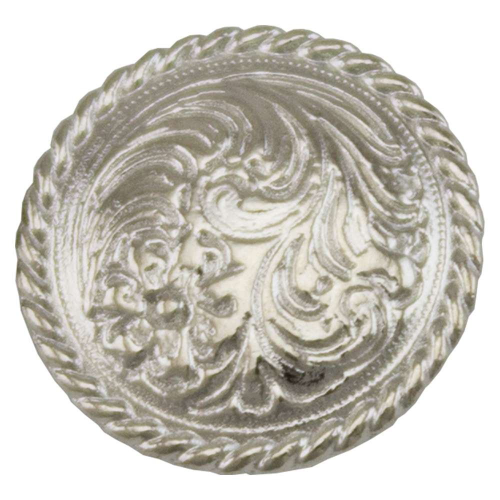 Decorative Screw Post/Concho. Spiral Berry or Floral Rope Edge are available in 3 finish options. Both measure 1/2" across and have a 3/16" screwback. Sold in 10pks. For Floral Rope Edge in Shiny Silver plate order item #115-198201.