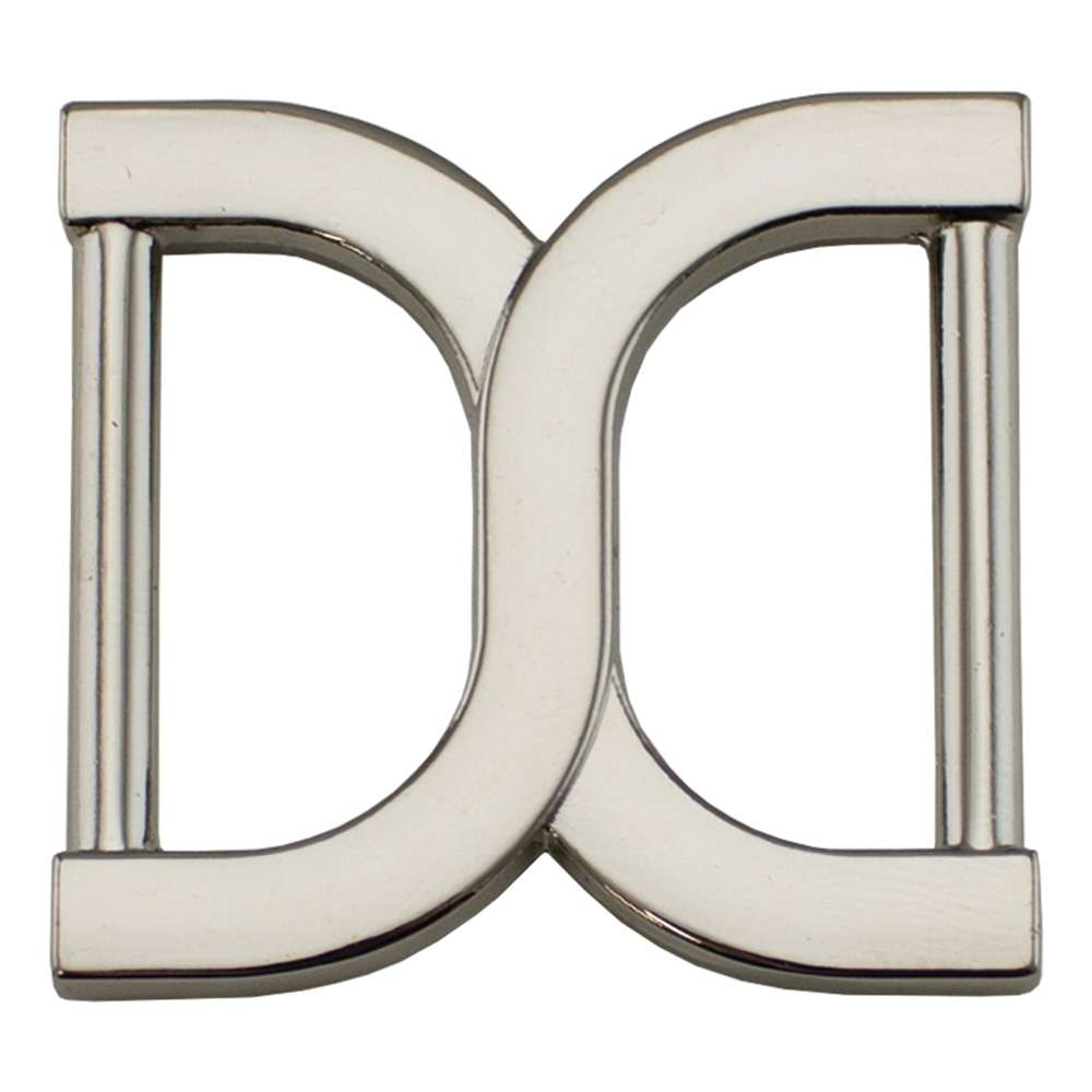 A Connector that looks like 2 decorative dee rings put together to form a figure eight. Will take up to a 1" strap. Overall measurements 1-3/8" x 1-1/2" tall. Item #020-300200.