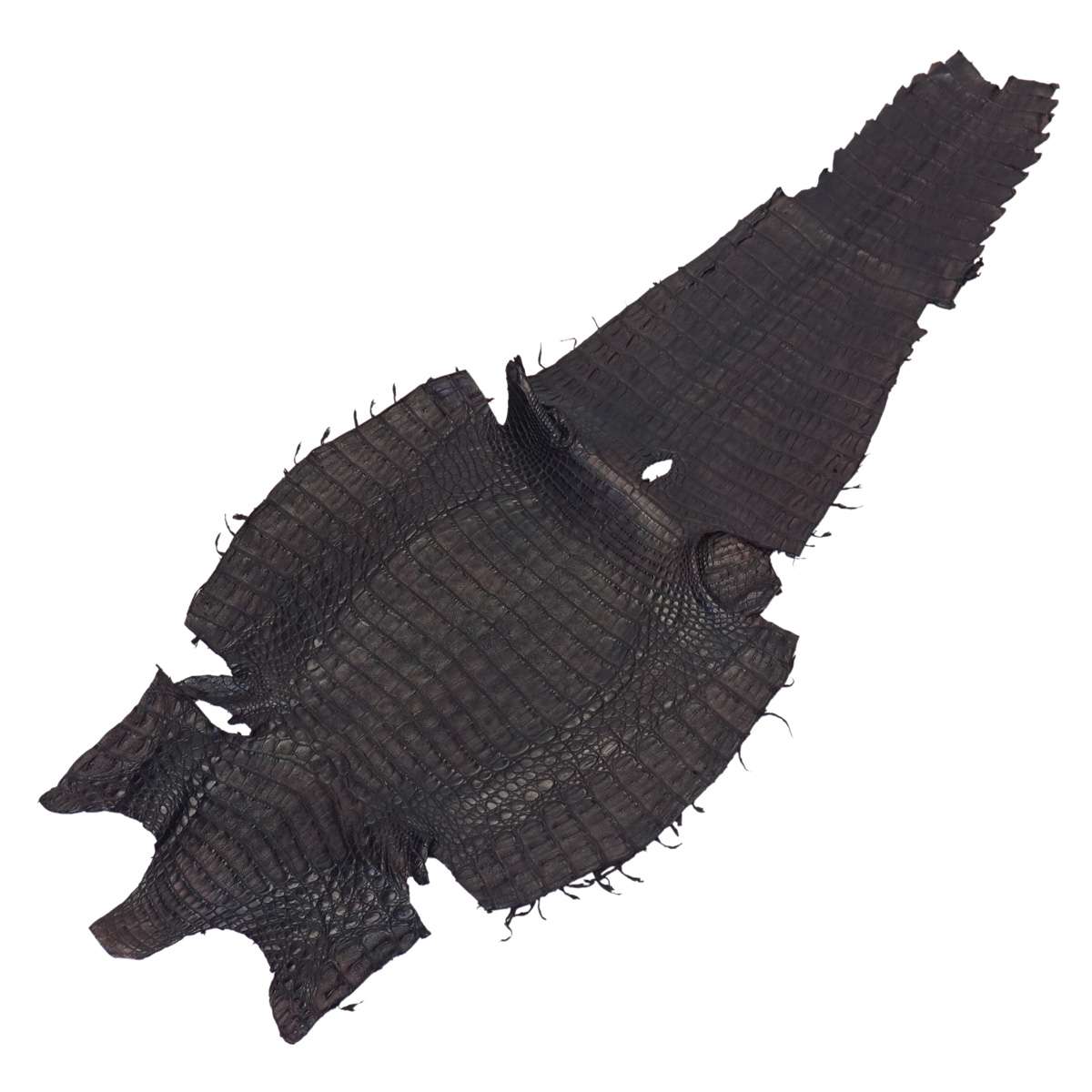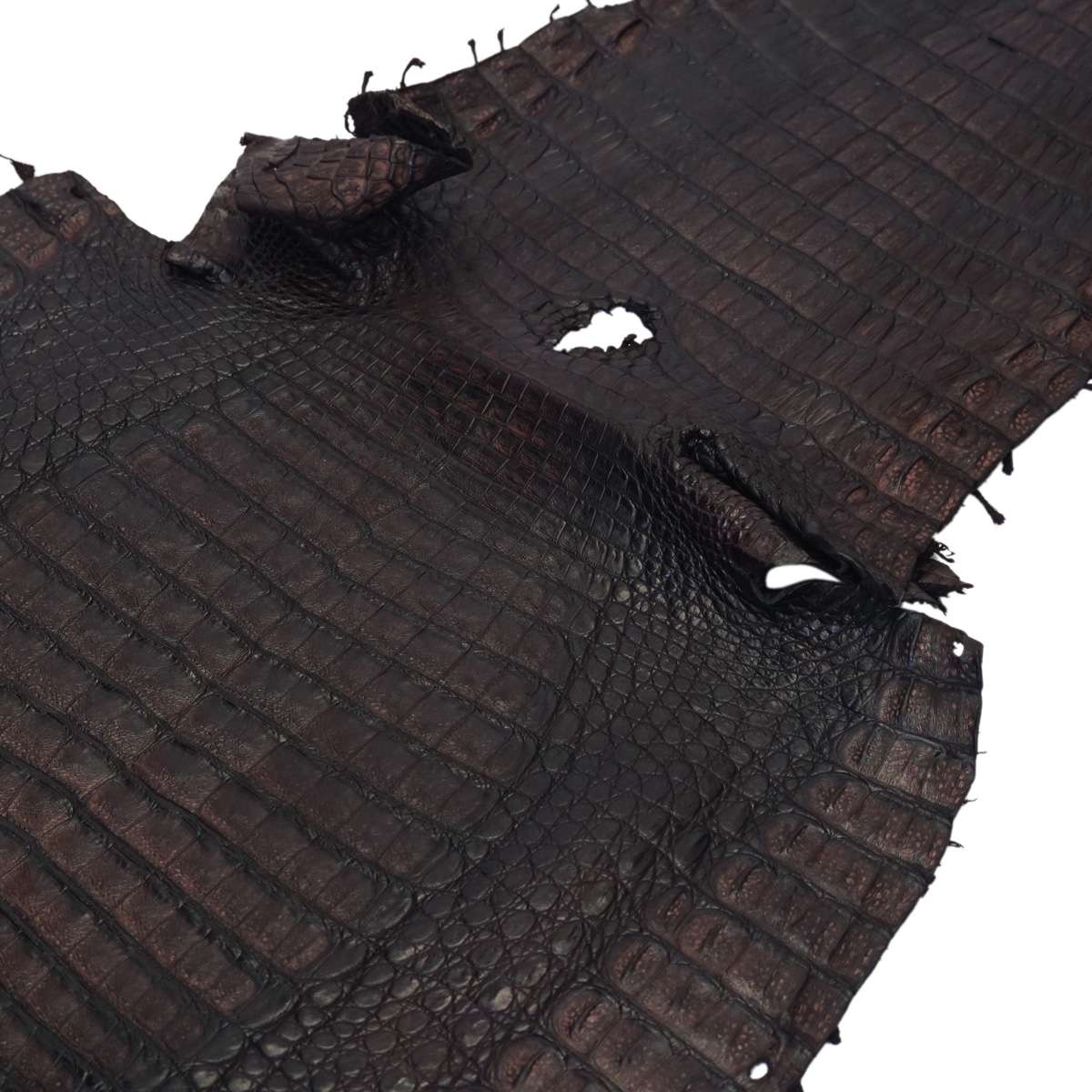 These highly desirable Caiman Skins have been cut down the back, showcasing the gorgeous belly plates. Tanned for a soft hand and supple feel, and dyed in a rich, almost two-toned brown. These skins have a satin finish resulting in a rich color and sheen. I’ve been told that I need to mention something that many folks are thinking is a flaw in the skin, so I’ll do my best. You will find that every single caiman skin has a hole right at the end of the belly where it meets the tail… THIS IS NOT A FLAW. Caiman skins are a natural product, so you’re gonna have to work around a butthole… I think most of us have had some experience with that! Ha! Regardless of the butthole, these Caimans are sure to make you money! Great for making smaller belts, or piece together with our 6-piece buckle sets! Also perfect for making handbags, clutches, wallet backs, trim, inlay, watchbands, and many other high-end luxury personal leather goods and accessories. Two sizes available! BCCS