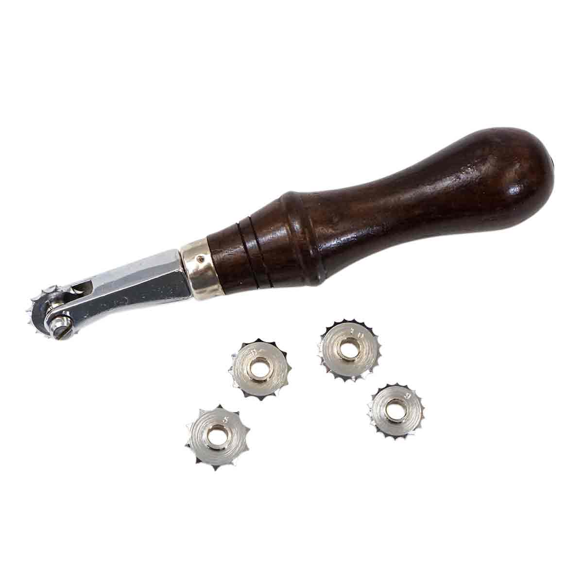 Overstitcher Set with six removable spacing wheels. Includes sizes 5, 6, 7, 9, 10. Wheel sizes represent holes per inch.