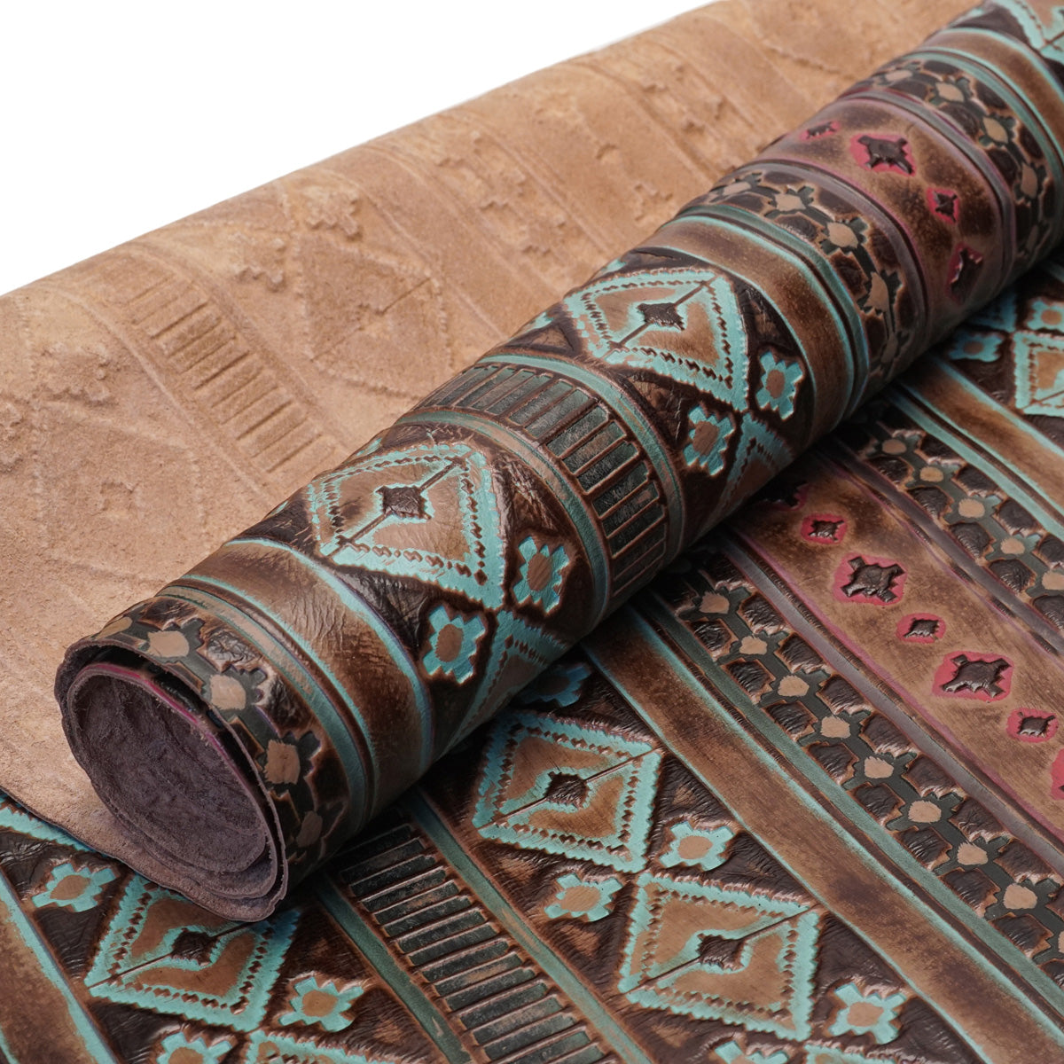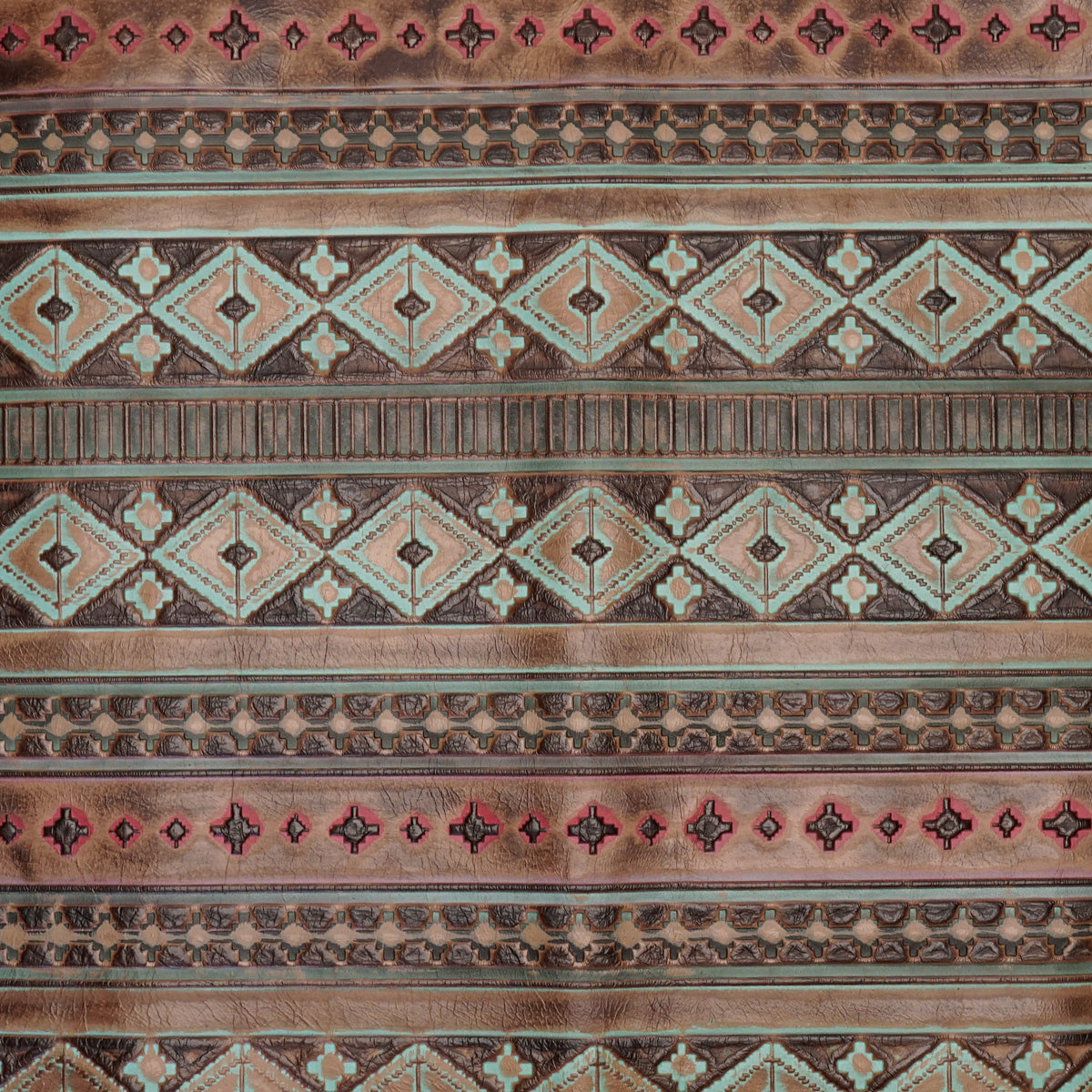 Bring native style to your next project with our North American Indian inspired embossed leather. This leather features unique geometric patterns and is dyed in a variety of weathered colors! We think these leathers will bring a unique flare to your next bag, journal cover or other lightweight projects! Great for making bags, totes, clutches, wallets, earrings, wristbands, cuffs, and other personal leather goods! This would also make for great upholstery applications, such as, seat covers, ottoman covers, table and cabinet inlays, and so on!