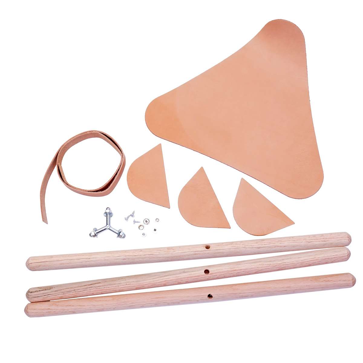Everyone LOVES a Tripod Stool! Now you can make your very own with our Tripod Stool Kit. Includes all the parts needed for assembly, including pre-cut veg tanned leather seat and leg pockets. And being veg tanned leather, you can either simply choose to dye, stain, and finish it… or you can tool and stamp it to create a carved beauty fit for a patootie (haha… see what we did there?!) Some additional tools/material required for completion.