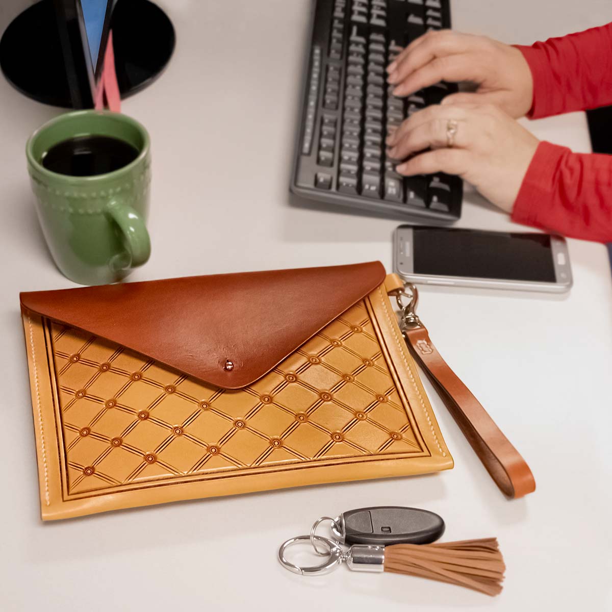Envelope Clutch Kit. Includes Premium Leather Parts, Hardware, Thread and Needle, Punching Pattern, and Assembly Instructions.