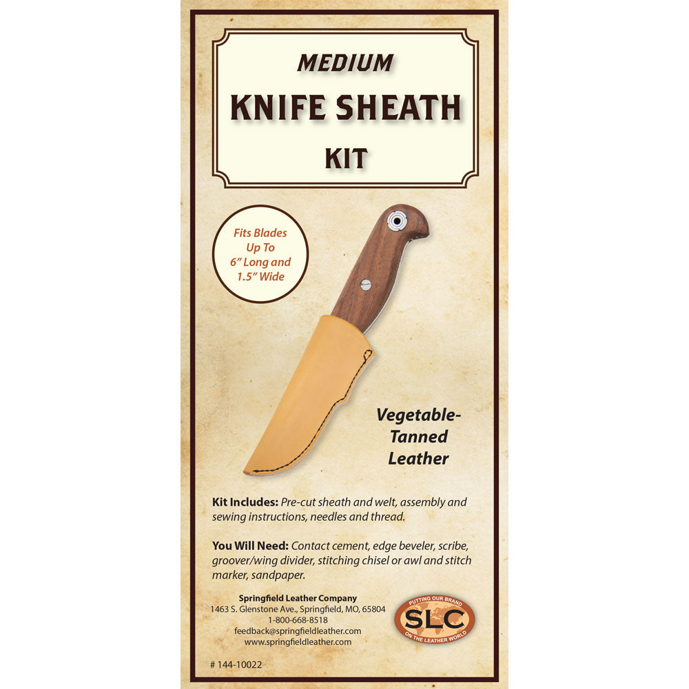 We'll get to the "point"...this universal knife sheath design is great for any leather crafter, from beginning to advanced! Yep, you can make your very own knife sheath that's a "cut" above the rest. Kit includes pre-cut sheath and welt from natural Hermann Oak veg tanned leather, stitching needles and thread, and assembly and sewing instructions. Fits blades up to 6 inches long (15.24 cm) and 1.5 inches (3.81 cm) wide.Â