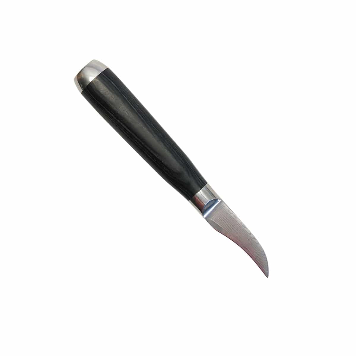 Both Damascus Trim Knives feature a Pakka-Wood handle. The grain is clearly visible on the handle of the curved blade, but the handle on the straight blade has a slightly darker color, which makes the grain a little less visible. DTK
