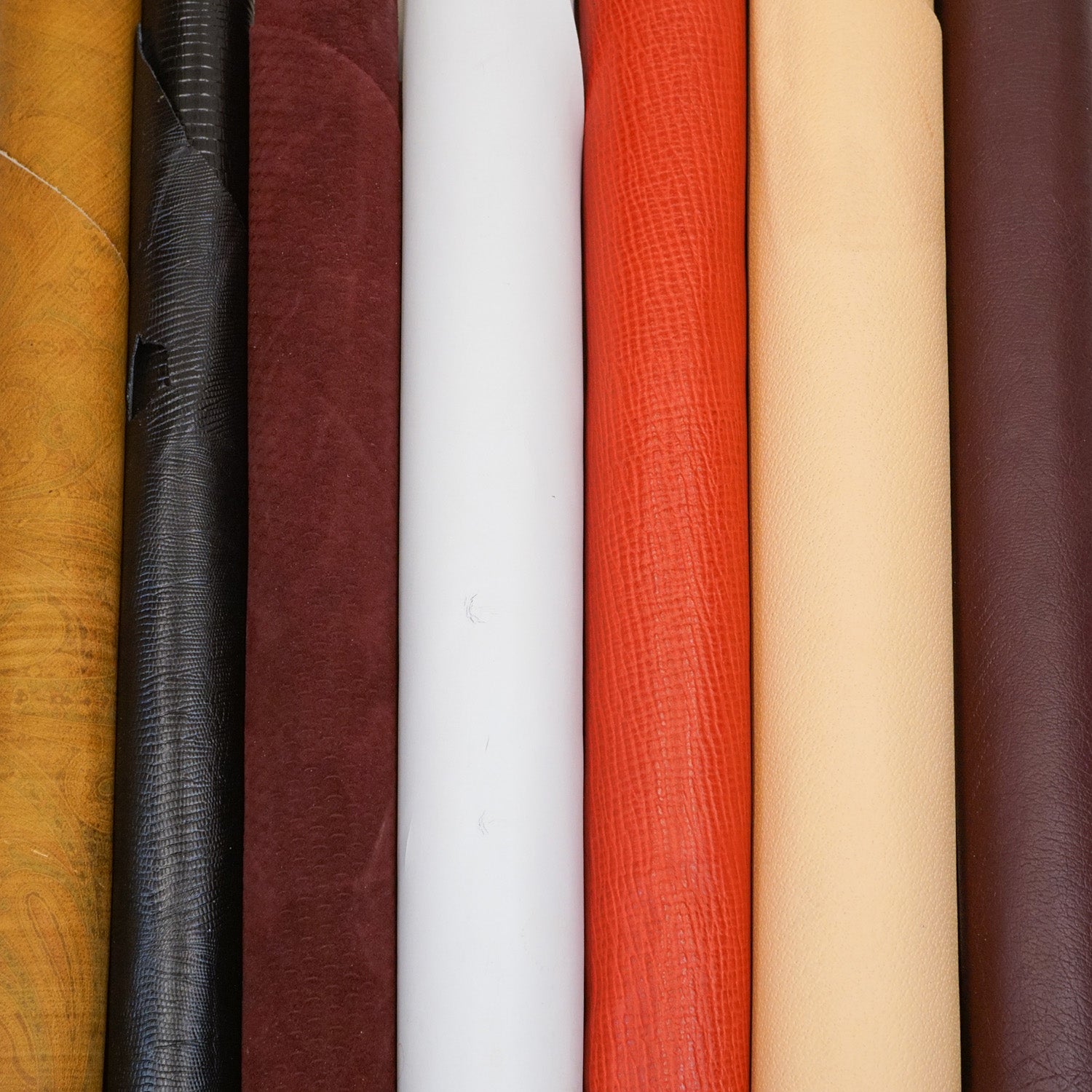 Most of it is finished splits, which is not a bad thing, but when it's stiff, 4 oz., or 5 or 6 oz., and the wrong color, then things get a bit sketchy when trying to sell it. Some of it is actually fine leather, but it's got a weird print on it. Some of it is as stiff as a board and a lousy color with no print. Some has some finish issues (cracking and such). Some is 2 oz., and ok. some is 5 oz. and ok. Some are just strange colors. Some are normal colors. Some are 3-4-5 sq. ft. pieces, some are cow sides and bends and double butts.