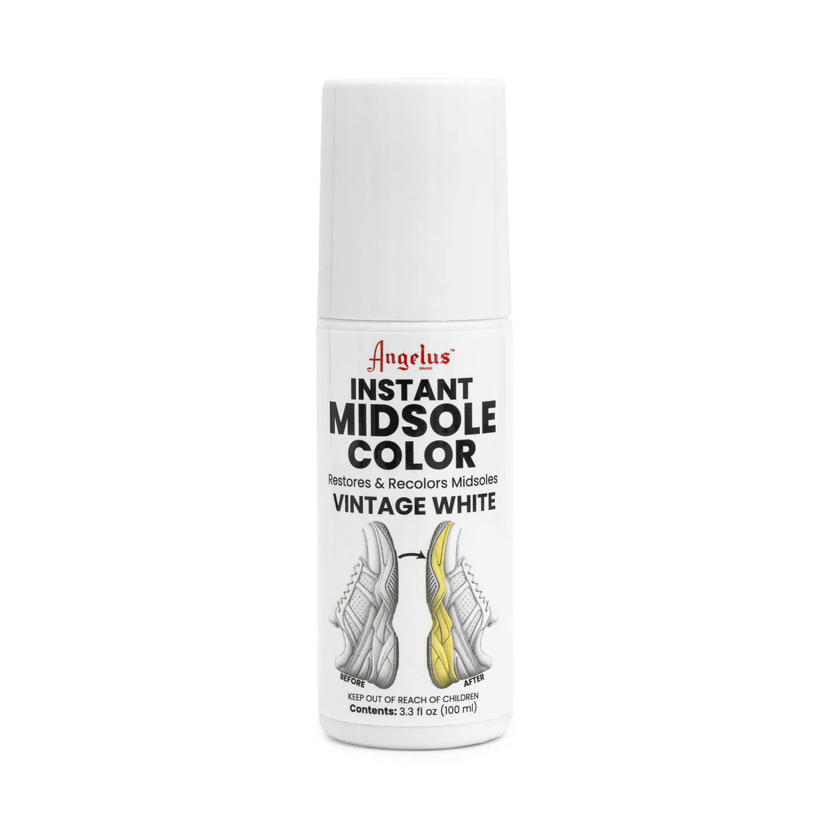 Notes: Semi Translucent. Can be used to change midsole color with varying results. Comes in applicator bottle for easy application.Transform your worn midsoles into a sleek, Jet Black, Vintage White, and Bright White color with our Instant Midsole Color. Designed to restore and recolor, this product will revive your shoes to their former glory, giving them a fresh, new look. Say goodbye to faded, discolored midsoles and hello to a deep, bold black that will make your footwear stand out. Step out with confidence, knowing your shoes look as good as new. --Angelus Instant Midsole Color is formulated to safely restore your midsoles back to a rich black color. It works exceptionally well on a variety of footwear, including sneakers, dress shoes, boots, and more. This versatile product is perfect for anyone looking to breathe new life into their favorite pair of shoes. --Angelus Instant Midsole Color in Vintage White is specially formulated to safely restore your midsoles to an elegant, aged white. This product works beautifully on a variety of footwear, including sneakers, dress shoes, boots, and more. Perfect for those looking to add a touch of vintage charm to their favorite pair of white shoes. --Angelus Instant Midsole Color in Bright White is expertly formulated to safely restore your midsoles to a vivid white color. This product works wonders on various types of footwear, including sneakers, dress shoes, boots, and more. Whether you're looking to refresh your favorite pair of white sneakers or add a touch of elegance to your dress shoes, this versatile product is the perfect solution. Please note, however, that this product is not meant to be permanent when used on rubber soles. For best results, it is recommended to use it on midsoles that are already black or dark in color. While it can be used to change the color of midsoles, the results may vary as the product is semi-translucent. Therefore, it is not recommended for use on white midsoles. With Angelus Instant Midsole Color, you can enjoy the convenience of an easy-to-use product that delivers impressive results. Restore your shoes, boost your confidence, and step out in style. AIMC