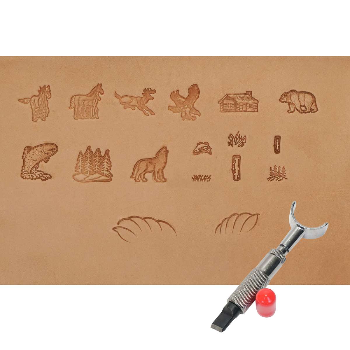 At last! A set of stamping tools and 3-D stamps that makes turning out professional looking leather work fast, easy and potentially profitable. These tools will give beginners and resellers alike the ability to create rich looking, hand tooled products such as wallets, belts, journals, and other personal items for gifts or resale. Tools are guaranteed for life! (*under normal use) Deluxe 16 piece set includes non-adjustable swivel knife, six stamping tools (F110, F111, F113, F114, F115, F116), and nine 3-D stamps (011-882002 Four Trees, 011-8847500 Wolf-Right, 011-8830901 Leaping Deer-Right, 011-8834500 Trout, 011-8842100 Log Cabin, 011-8830100 Landing Eagle-Right, 011-8831600 Mare & Colt, 011-8831100 Running Horse-Right, 011-8830300 Bear). Hefty Handle needed for 3D stamps sold separately.Â