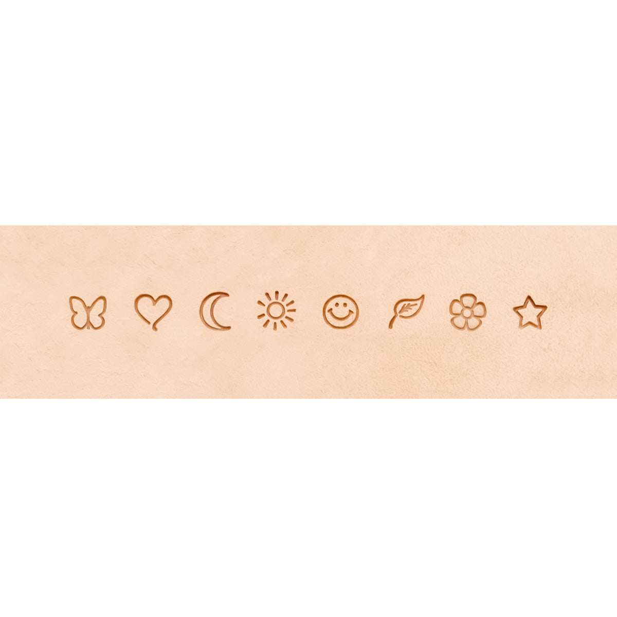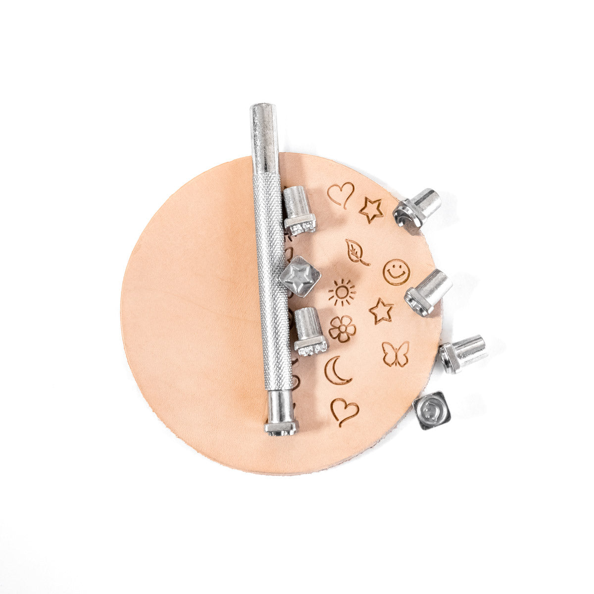 8 piece assorted 3/8" stamps. Includes 3-5/8" stamp handle.