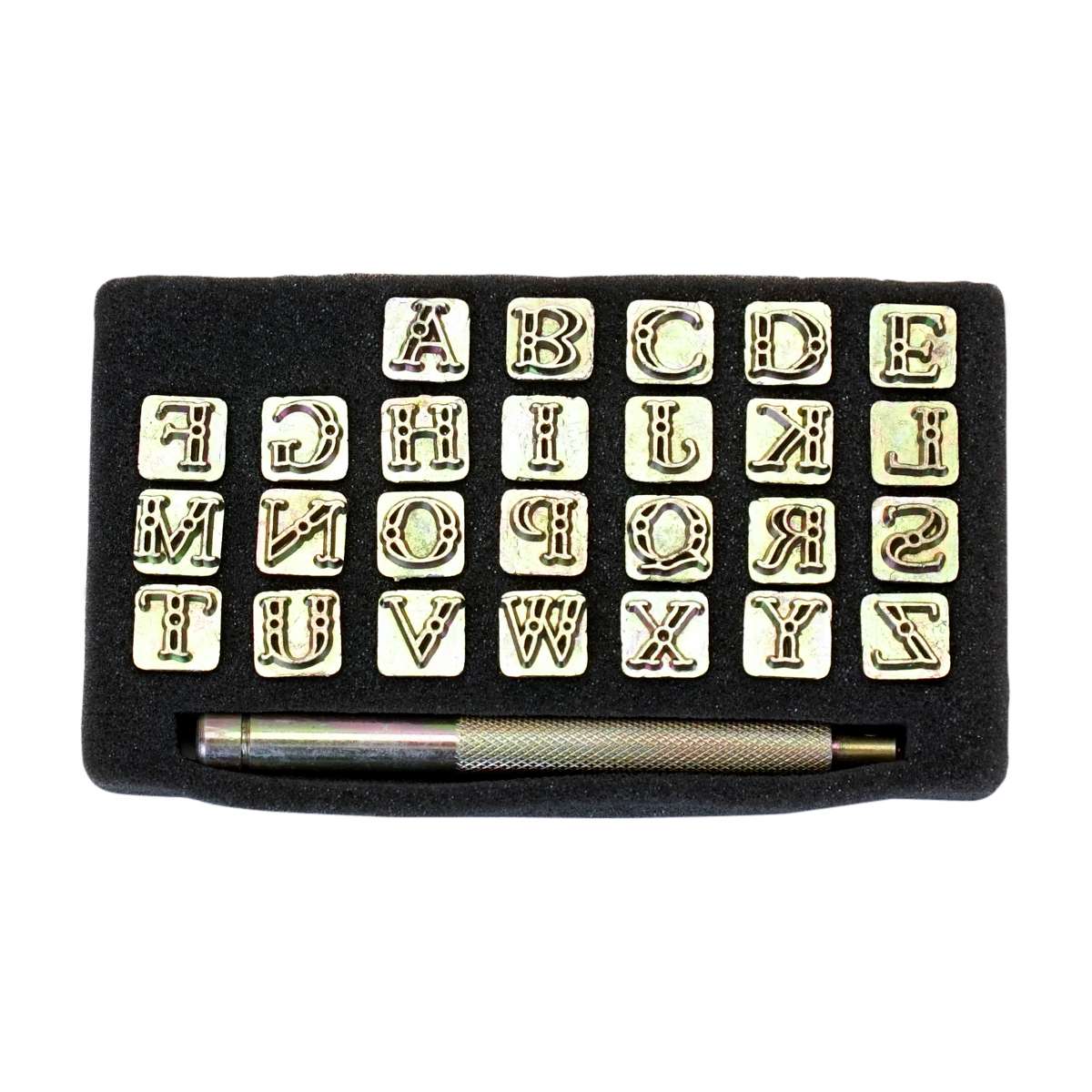 26 piece Fancy Craftmaster Alphabet Stamp Set. Includes stamp handle and storage box. Available in 3 sizes - 1/2", 3/8", 3/4" and 1/4".