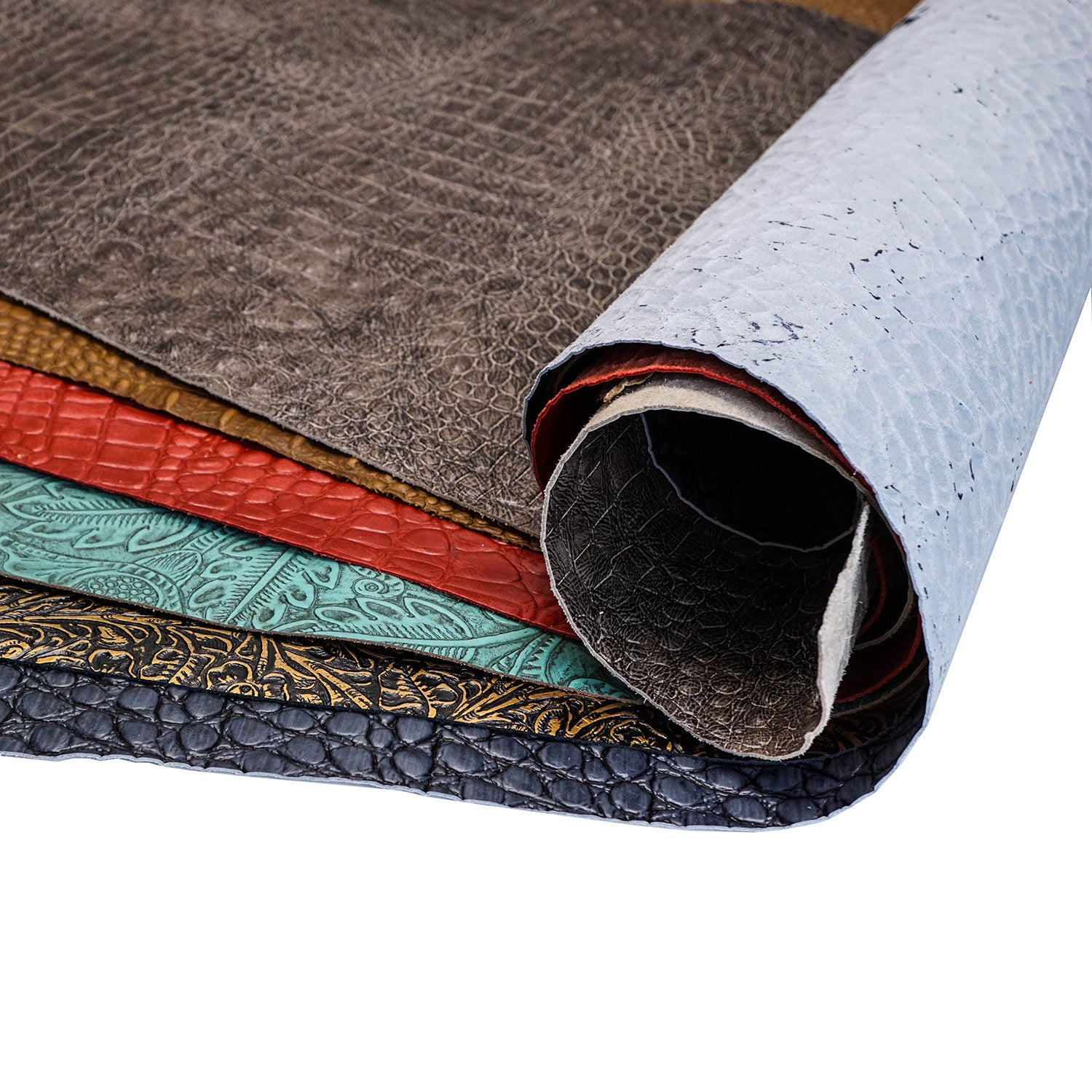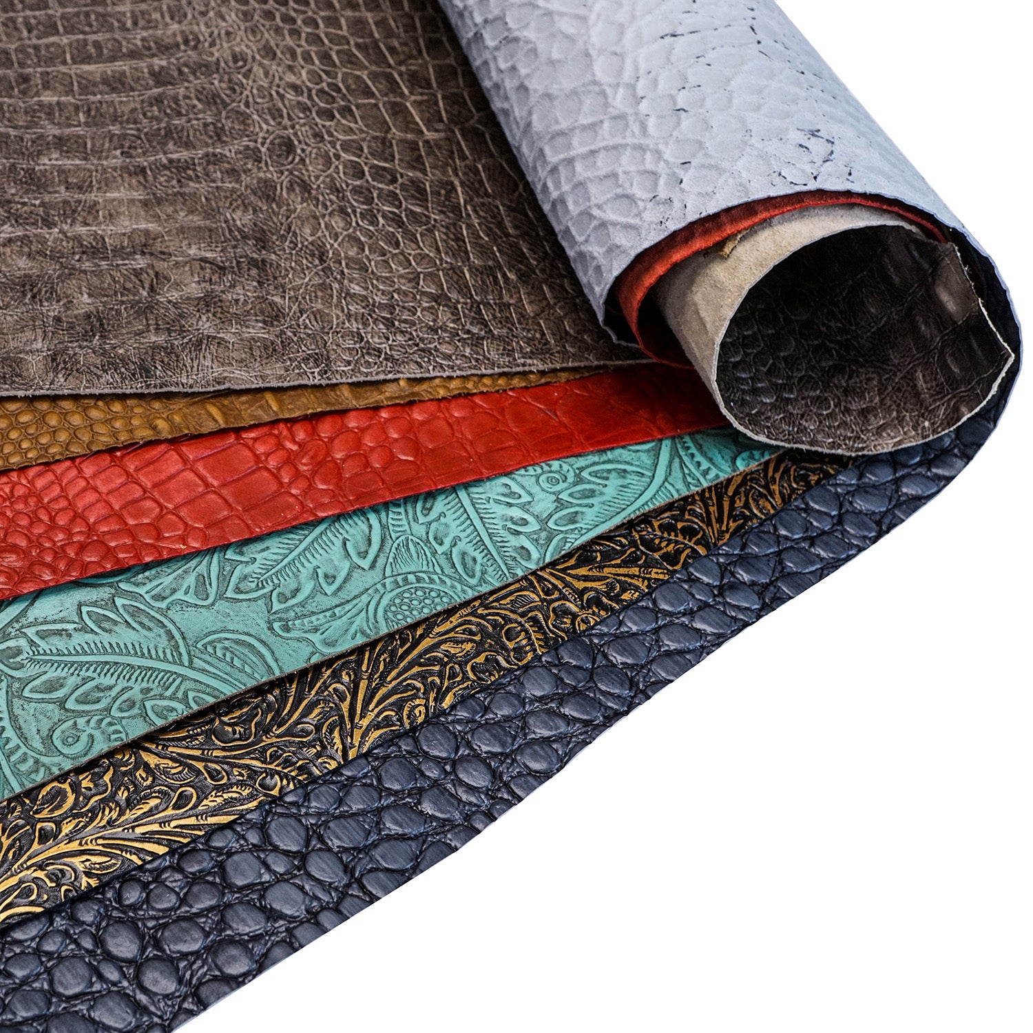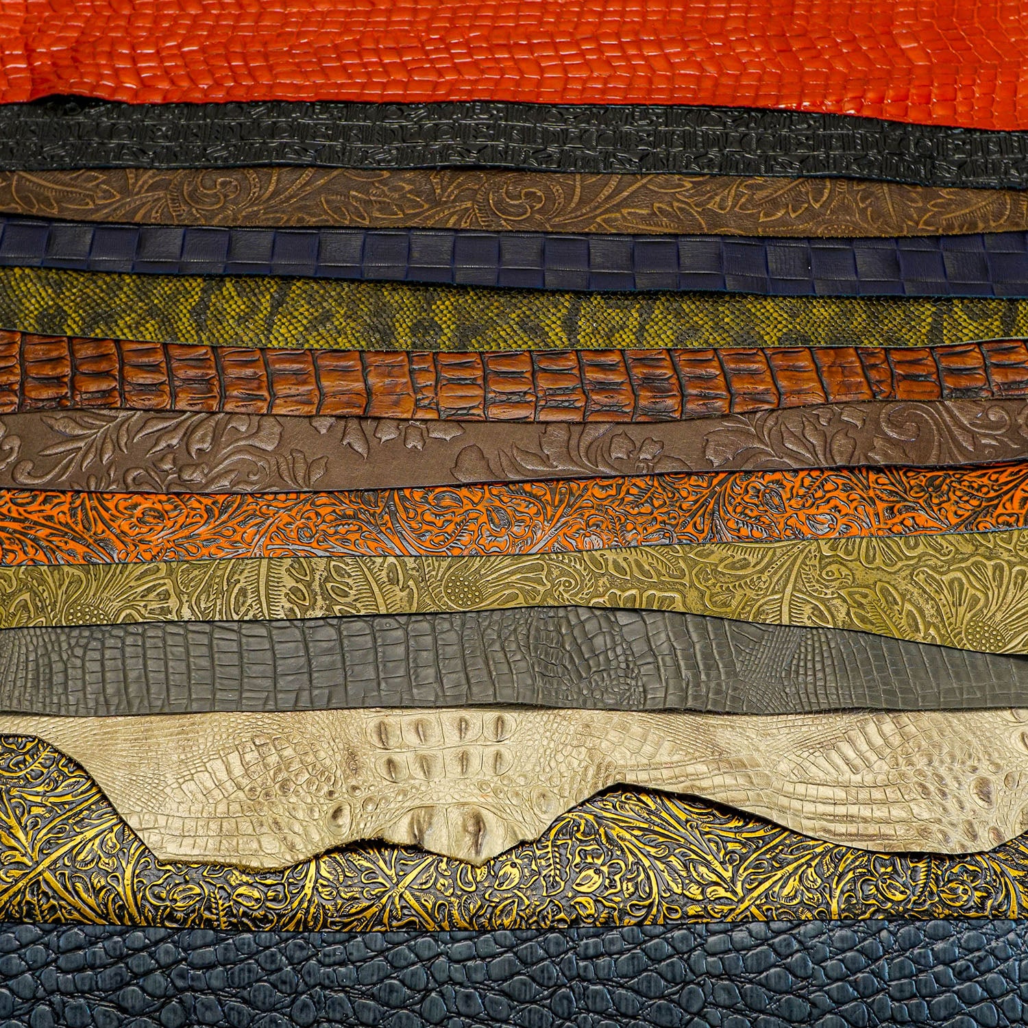 Consisting of mostly high embossed, master croc, and jellybean croco style gator prints, some snake, and very high-end florals, these leathers will give you the versatility to create a variety of upper-end projects.Â