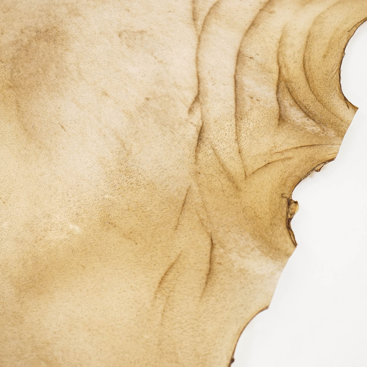 This is an excellent choice for making lamp shades and smaller drums, just keep in mind that its not as thick as the cow rawhide. All skins are unbleached. Most of these skins will cut a 18-22" drum with overlap. 1-2 oz. (.4 - .8mm) Sold by the skin.