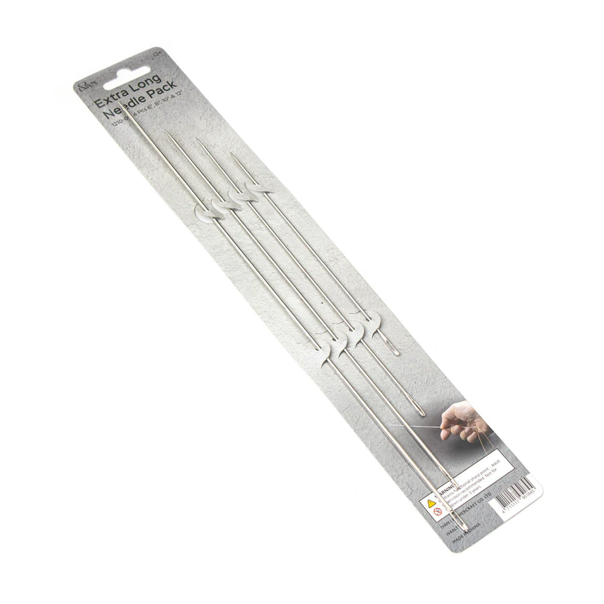 The extra-long needle pack comes in sizes of 15cm (6"), 20cm (8"), 25cm (10"), and 30cm (12"). These needles are straight, extra-long, and made from heavy steel wire and have large eyes. They are expertly crafted and are fantastic for use with beads, webbing, leather, upholstery, restoration, and repair, sewing edges, and stitching through padding.
