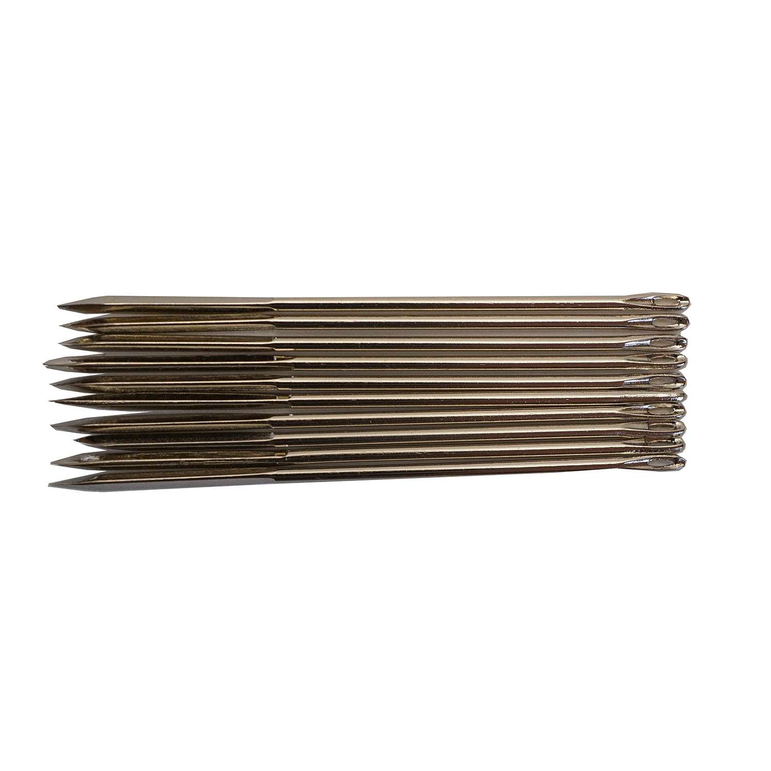 Glovers needles are extremely sharp with a triangular cutting point for sewing leather, suede, man-made fabrics such as canvas and other stiff materials. Item #130-119113.