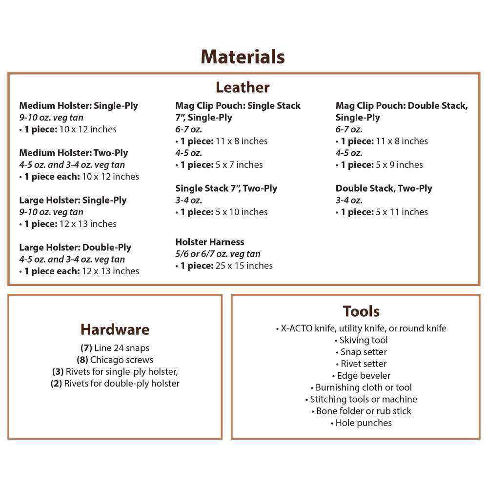 Take a shot at this pattern! The SLC Shoulder Holster Pattern Pack features full-sized patterns and color instructions for 2 different holster sizes. The patterns will accommodate most large- and medium-frame semi-automatics. Recommended for advanced leather crafters. View materials list in the photo scroll bar; hover over photo to zoom. Item #144-10050.