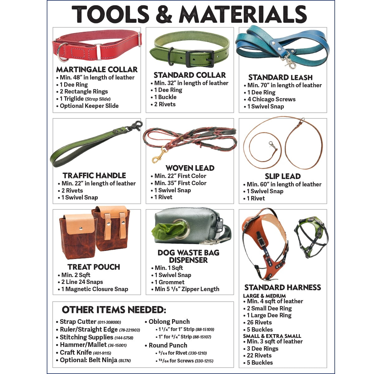 Options: Martingale Collar, Standard Collar, Standard Leash, Traffic Handle, Woven Lead, Slip Lead, Treat Pouch, Standard Harness (4 sizes), and bonus Dog Waste Bag Dispenser