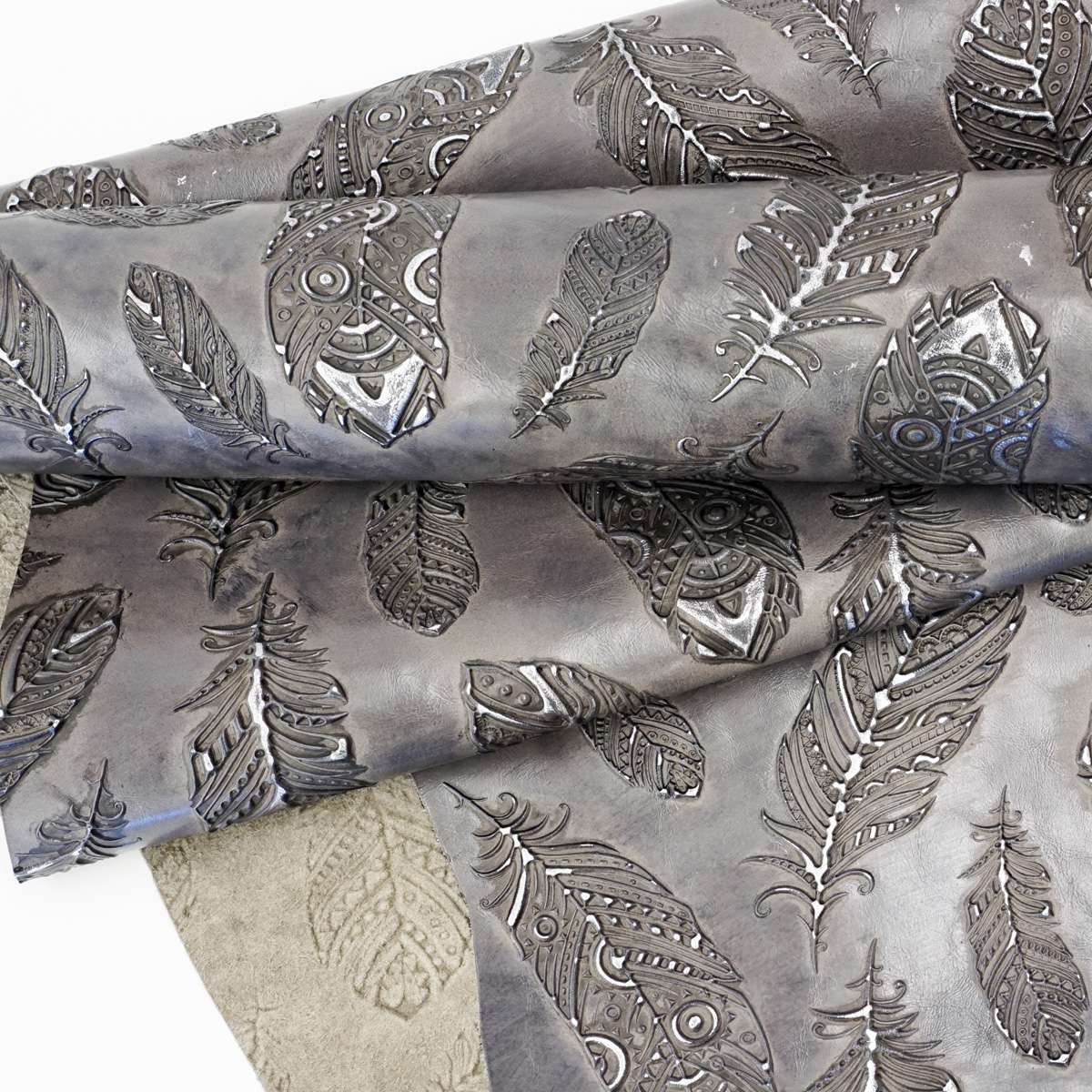 Plume embossed and printed hide - Pewter. 2.5 - 3.5 oz. Sold by the square foot. Hides average 50-55 sq ft.