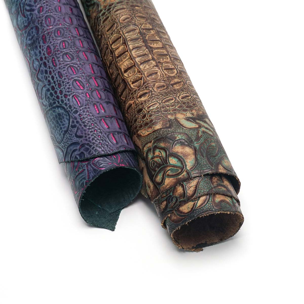 Get the best of both worlds with our Floral Croc Embossed Cow! Featuring the prized Hornback design, bordered by a large, bold floral print, in a repeating pattern (print runs length of side NOT width, neck to butt). Done in two-tone colors, with a magnificent tipping process that highlights every detail and illustrates depth. This fun and unique design is perfect for clutches and bags of all sorts, totes, belts, and other personal leather goods, as well as upholstery applications like seat and ottoman covers, and cabinet and table inlays.