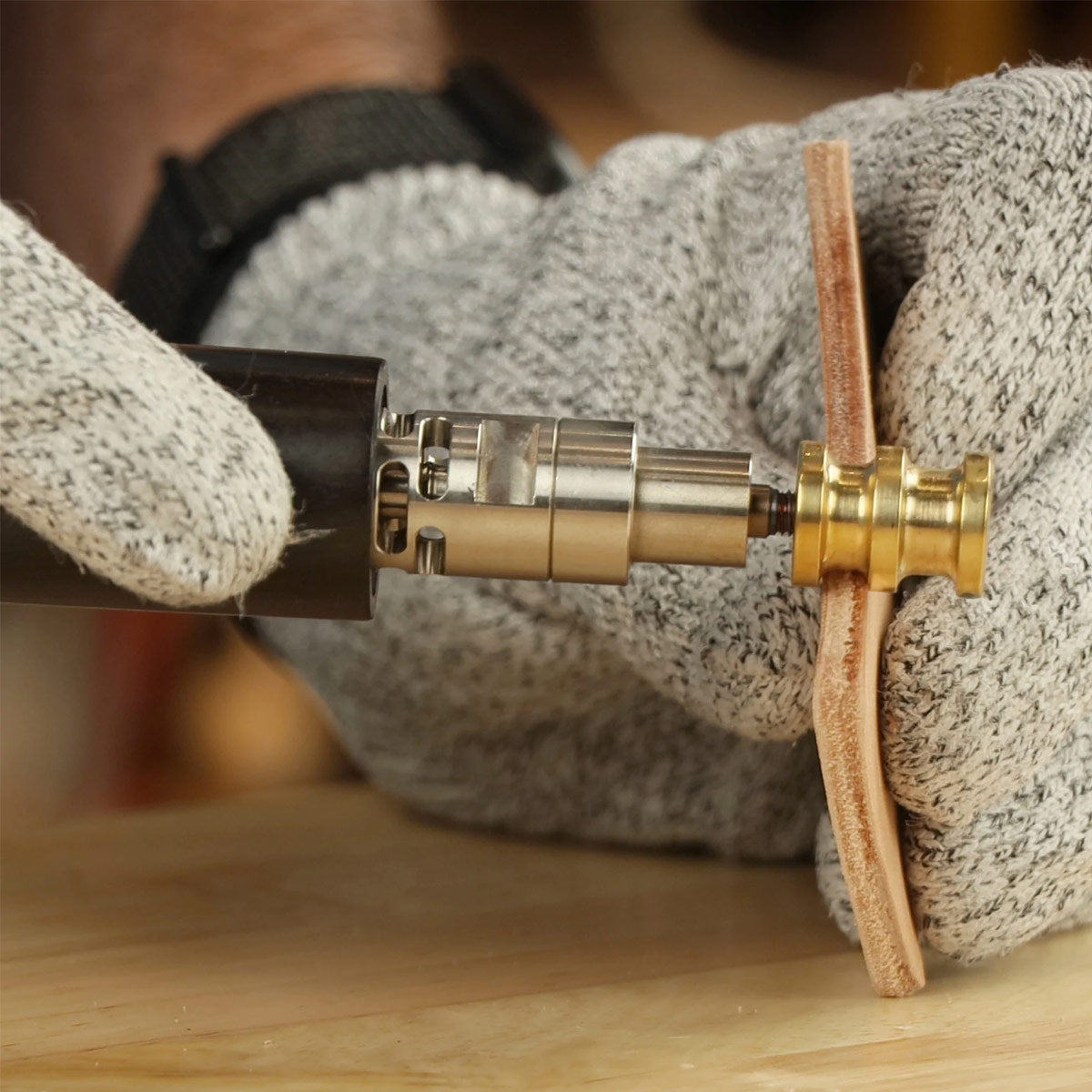 Creaser and burnishing tips for Craftplus® Edge Creaser. Polish wider edges, round corners and create fancy grooves with this pro tip set. Set includes five interchangeable, stainless steel and brass tips: L2.0 Tip: 1.5mm straight border, 0.5mm straight groove. G1.5 Tip: 1.5mm round border, 0.5mm straight groove. FN2 Tip: 1mm straight border, 1mm angled groove. FNR2 Tip: 1mm straight border, 1mm angled groove. Groove Burnisher: 5mm and 6mm dual grooves for thicker leather. Plus, an Allen Wrench and wooden peg.