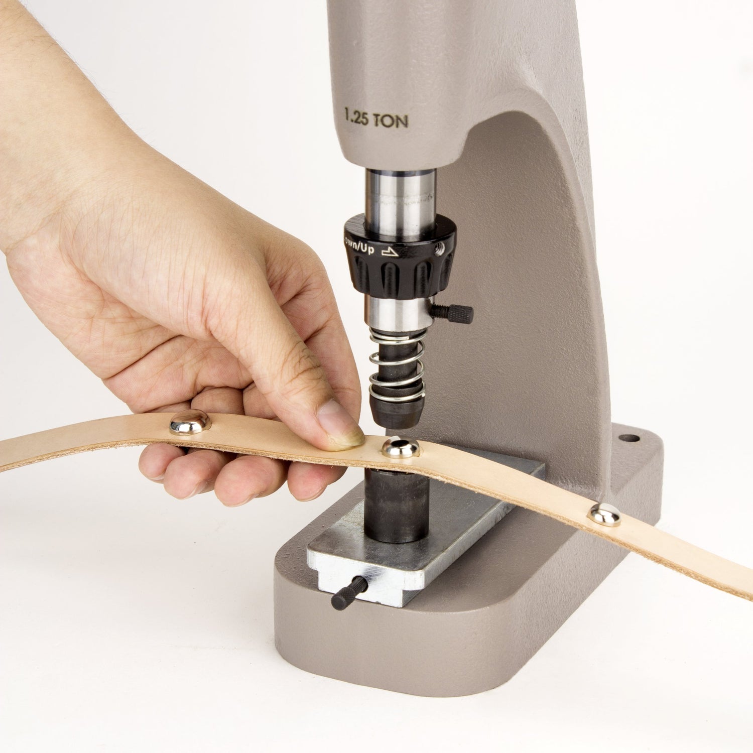 This is a complete, patented hand press system designed to work with over 20 custom setting dies (sold separately) to set grommets, eyelets, rivets (including tubular rivets and rivets and burrs), snaps, and spots! Will also punch hardware and stitching holes! This multi-purpose press could also be used as a dedicated machine for imprinting and embossing vegetable tanned leather.