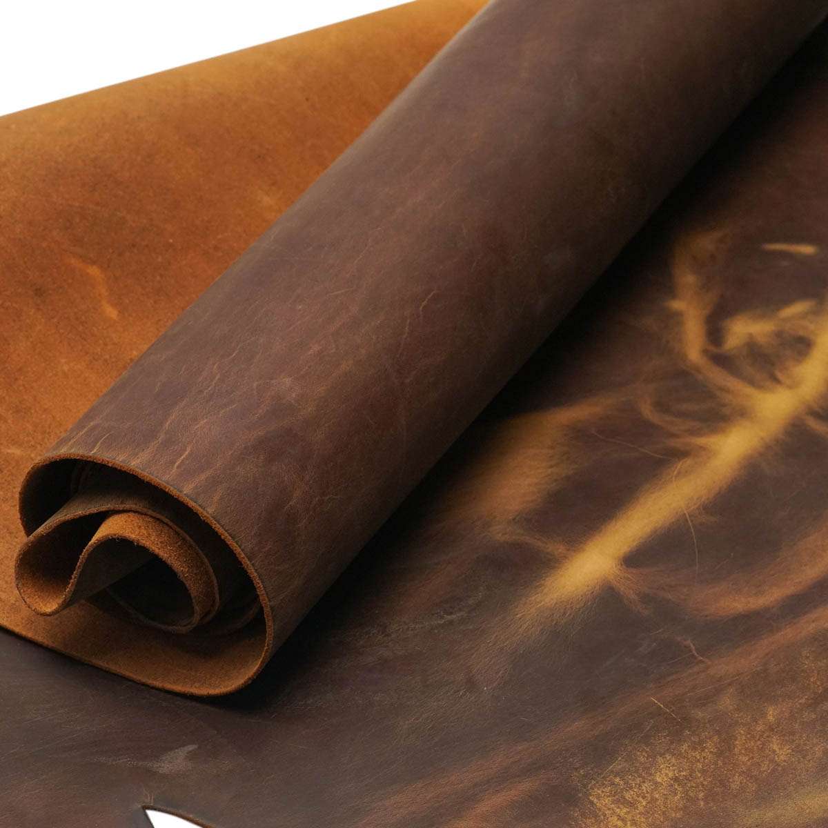 Look at this pull up! Introducing a beautiful stock oil tan: The SLC Oil Tan - Folklore! These are very rich looking dark brown sides, with a rich oiled finish, light colored pull up, and slightly firm hand. Great for any project where you want super durability like heavy chinks, aprons (use our apron pattern pack!), large duffel bags, or to use on tack. We can split to 4 - 4 ½ if you wish. At 4 to 4 ½ oz, sides would not be quite as firm, perhaps a little thin around the belly area, and still perfect for chaps and chinks, and all sorts of bags, totes, duffels, and backpacks.