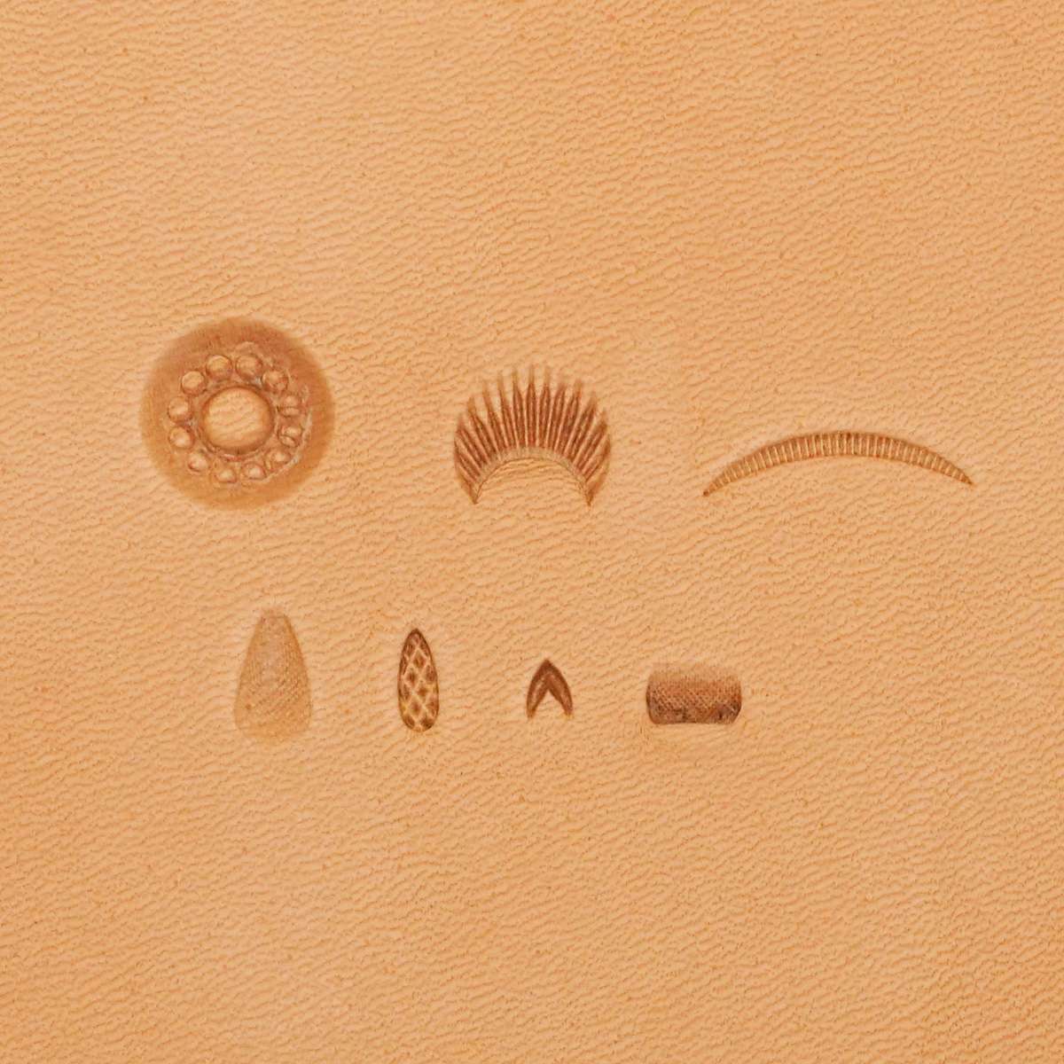 This is the set of tools you see Denny Lowe using on our leathercraft and tooling videos and Saturday Classes! Each one has been personally chosen by Denny, with the novice in mind! The set consist of seven basic stamping tools: PB013 Beveler, BW17 (P217) Pear Shader, U858 Mulefoot, C830 Camouflage, V715 Veiner, A888 Background, and a PJ040 Specialty Flower Center, as well as our 011-800200 Deluxe Adjustable Swivel Knife with 3/8” straight blade! These sets are a great way to introduce people, young and old, to the wonderful world of leathercraft!
