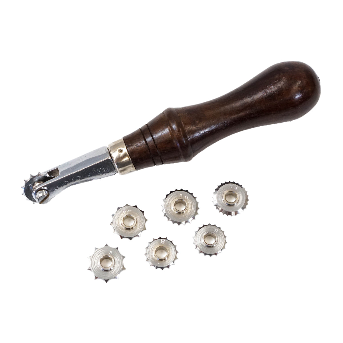 Overstitcher Set with seven removable spacing wheels. Included sizes 5, 6, 7, 8, 9, 10, 13. Wheel sizes represent holes per inch.