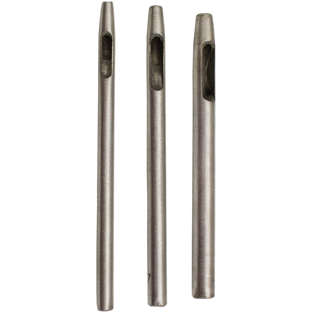Here we have three of the most common sized round drive punches used to make holes to fit rivets, snaps, conchos, belt tip holes, etc. all together in a pack for what you could very likely pay for one single punch! Round Punch Drive set includes 1/8" (3mm), 5/32" (4mm), and 3/16" (4.8mm). Item #378-5000