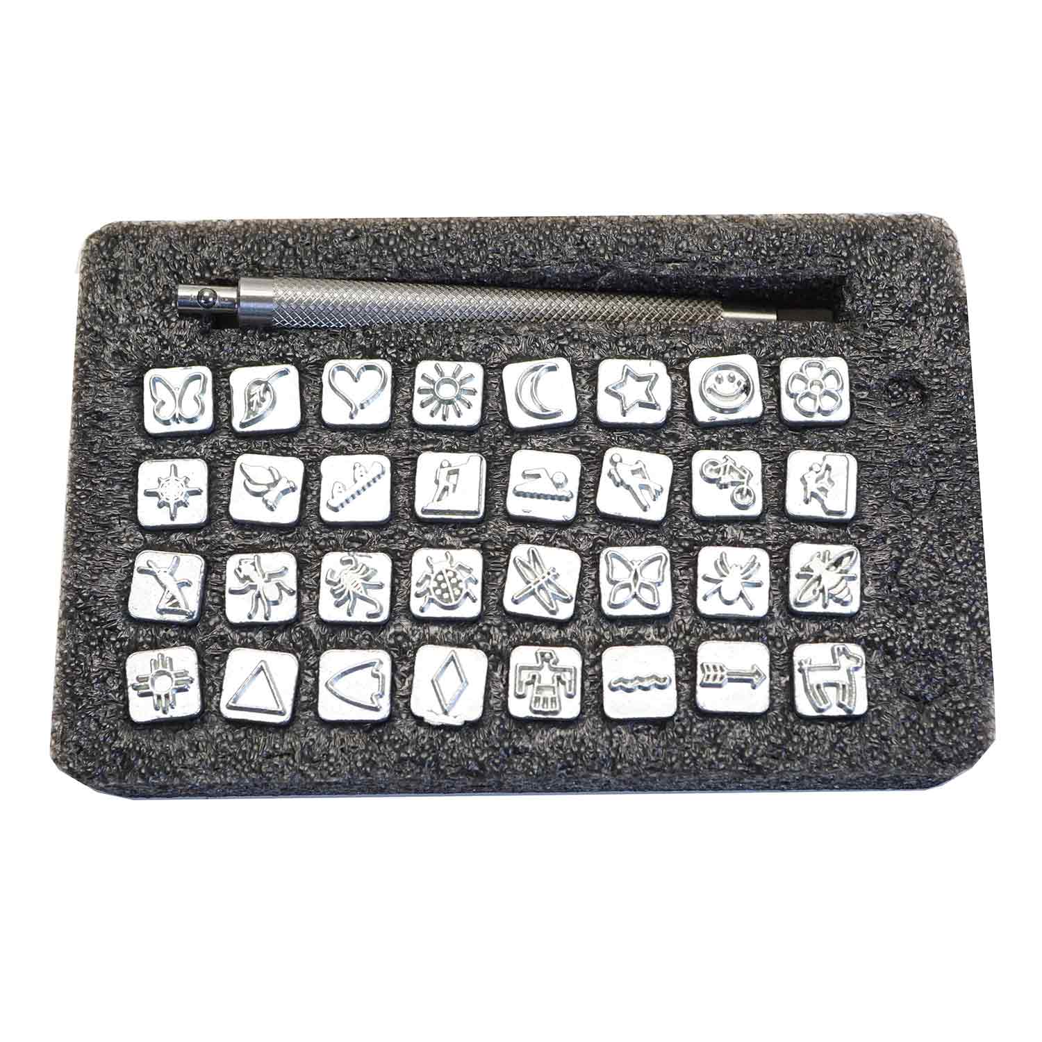 Summer Camp Stamp Set. This set includes 32 stamps that are 3/8" and a stamp handle, which measures 3 - 3/4" in length. Actual stamp impressions will vary in size.