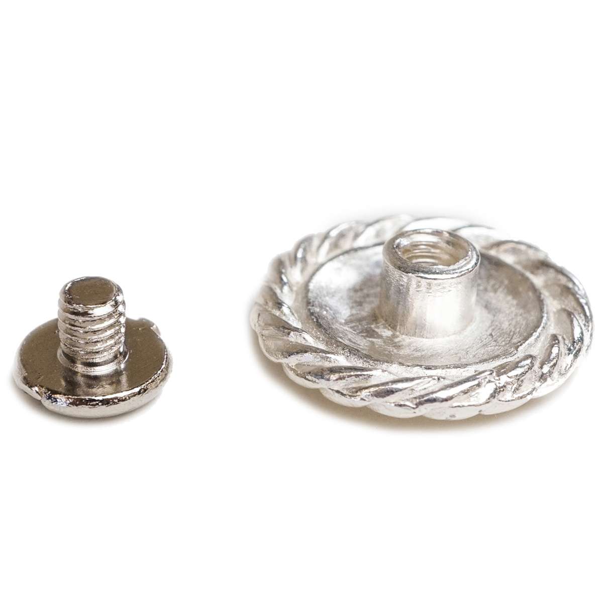 Polished silver plate with a gold border. Round 3/4" Screwback.