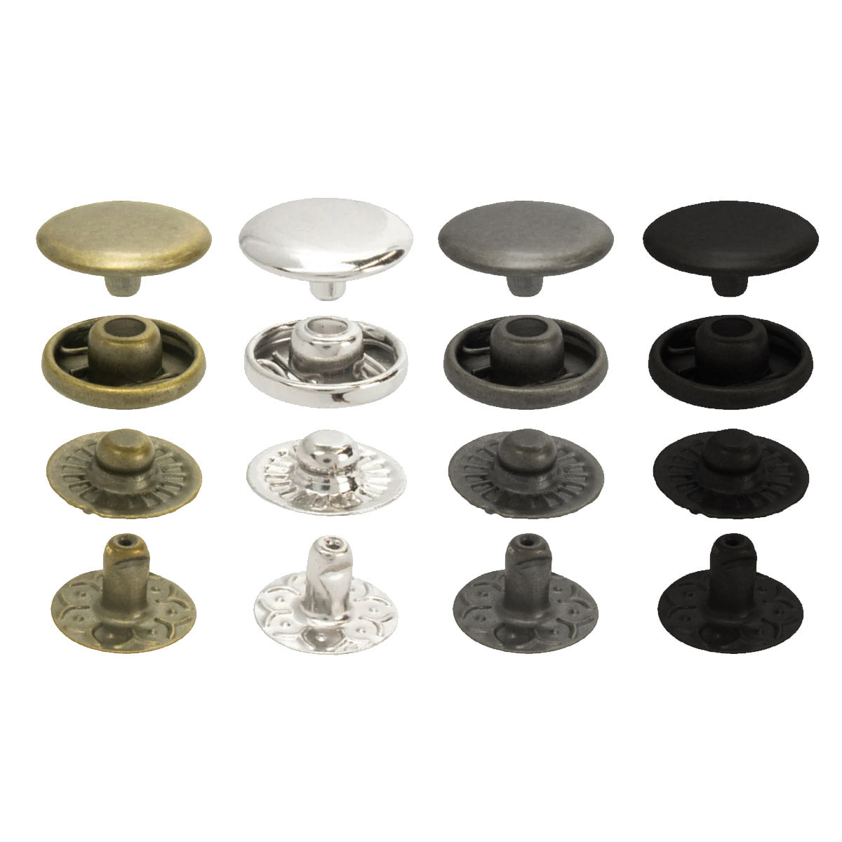 Each snap consists of four parts: Cap, Socket, Stud, and Post, and require designated setting tools.