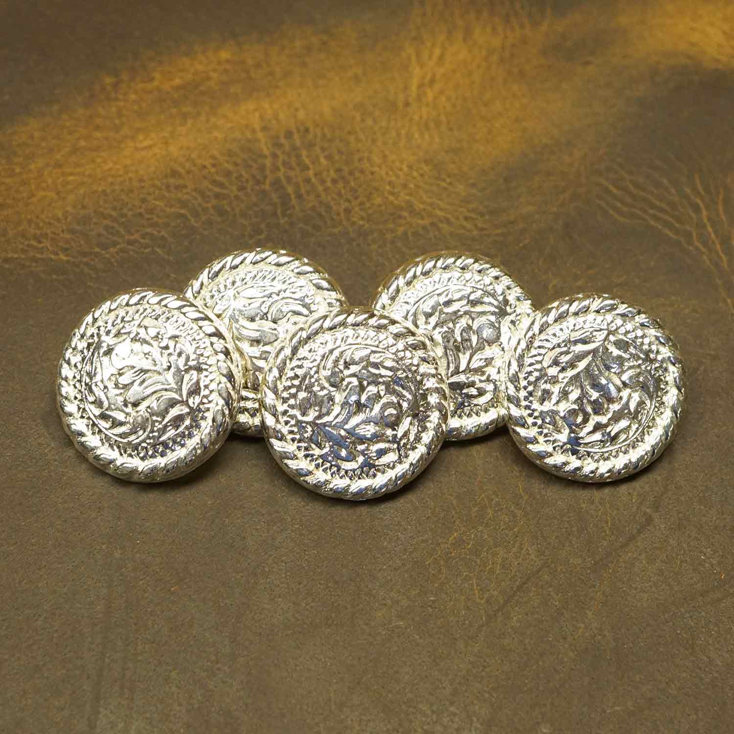 5 pack of 3/4" round Filigree Conchos, with a silver finish and a rivet back.
